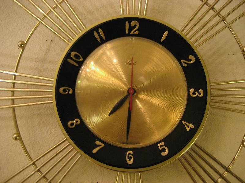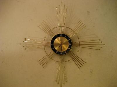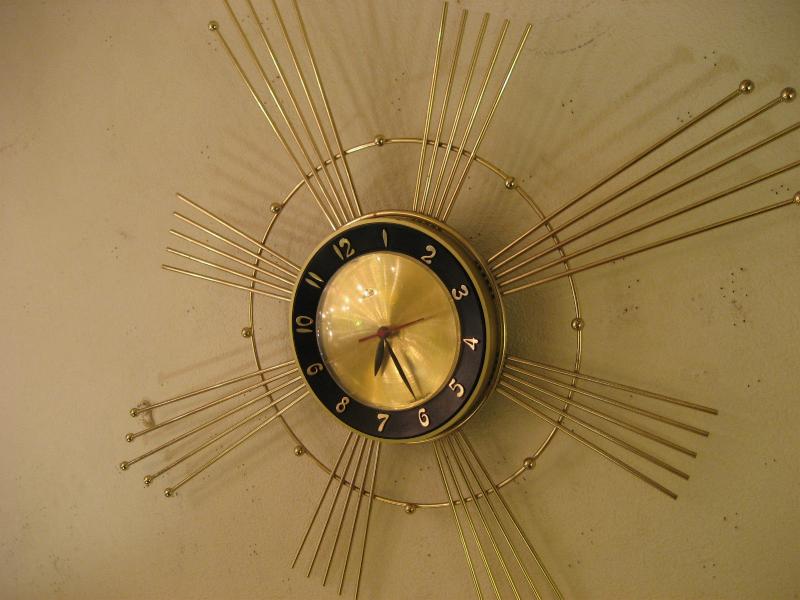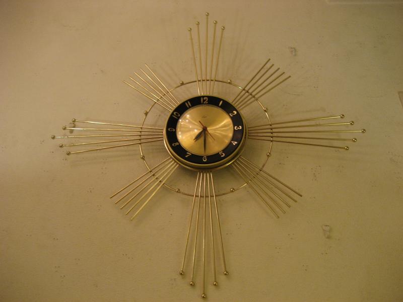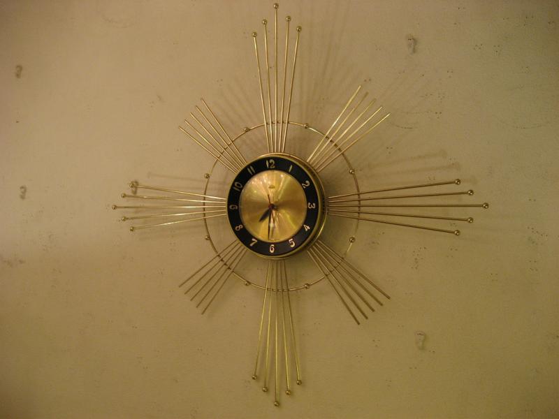 | スターバースト/サンバーストウォールクロック / LUX社製, MADE IN USA 50-60年代 ゴールドブラスのスプートニクスポークフレームがアトミックでクールなスターバースト壁掛け時計。文字盤は黒金で針はブラックハンド。 ムーブメントはバッテリータイプ(単3x1個使用)に交換済みですので時間も正確です。 |