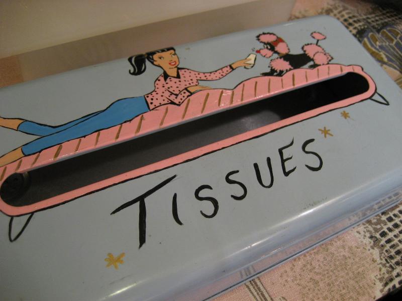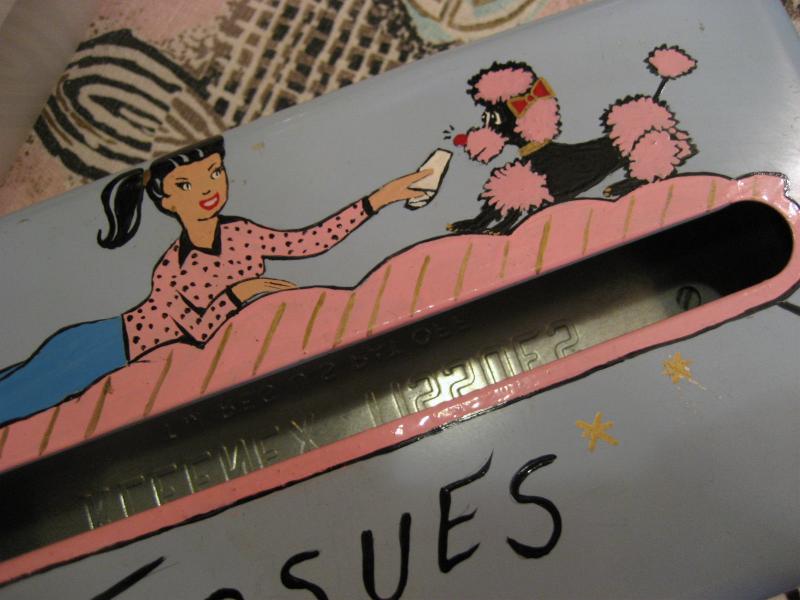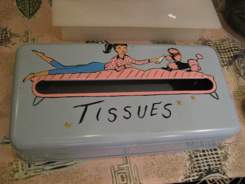 USA. メタル製のビンテージティッシュボックス。「50'sの女の子とプードルがベッドの上で遊んでいるところ」が描かれているキュートなバニティピース!壁掛け用フックホールも開いているので用途も広く便利です。 |