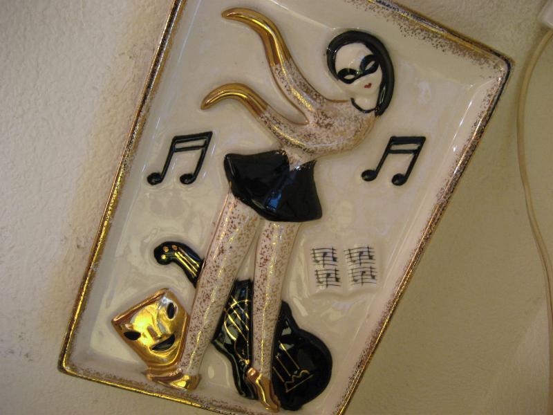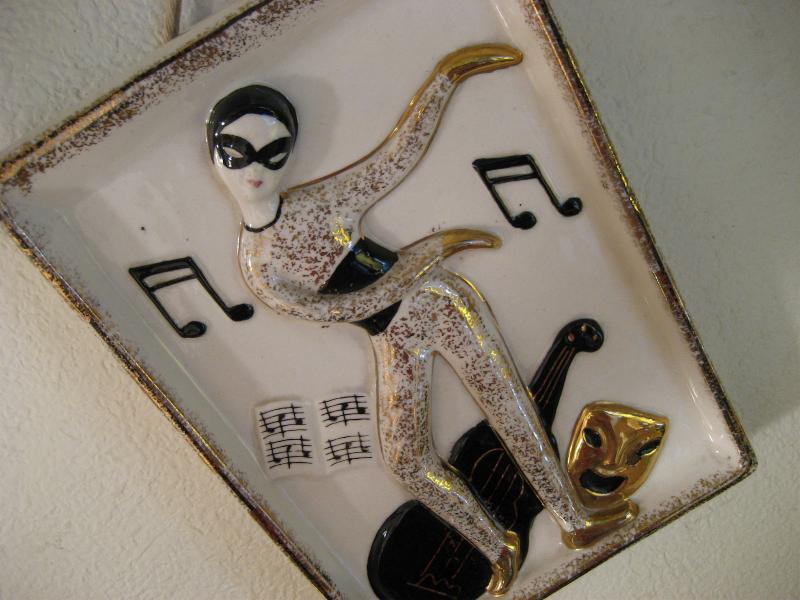 | ペアハーレクイン壁掛け 50年代 USA. 陶器製のビンテージハーレクインウォールデコ。白黒にゴールドアクセントカラー。ハーレクインダンサーに楽器・音符・楽譜・ツーフェイスのデコレーションが超クール! |
