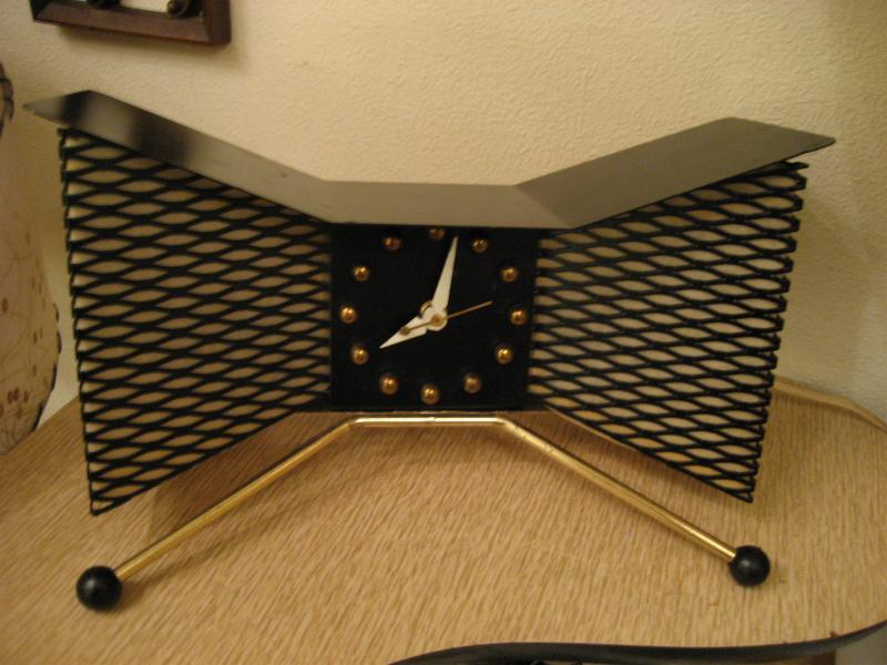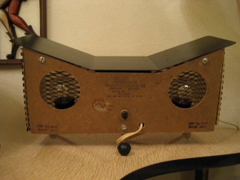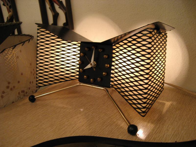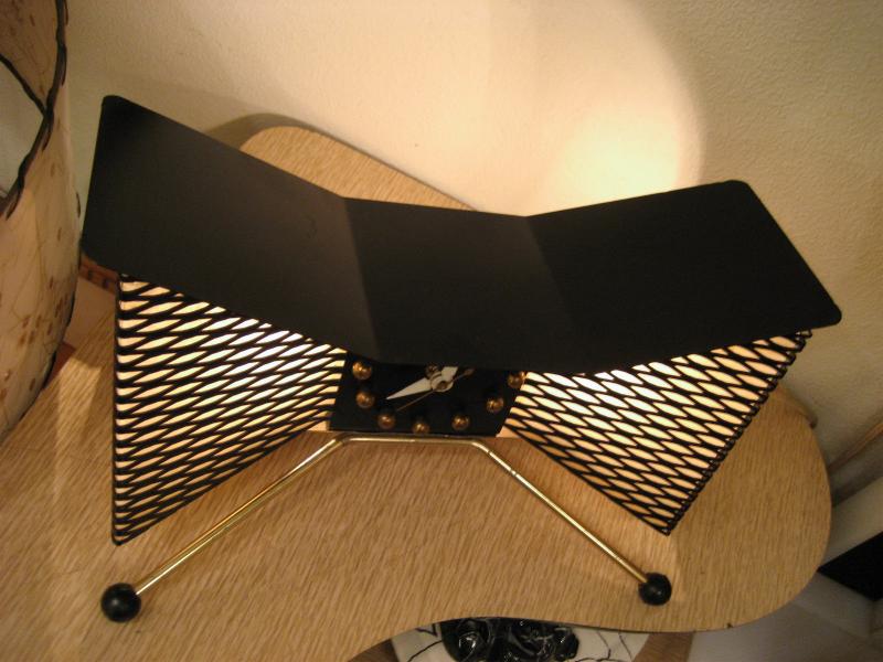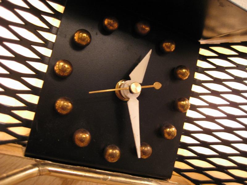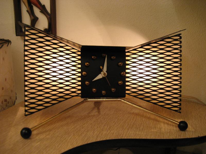 | ビンテージライトアップシェルフクロック(置時計) / 50年代 スナイダー社製 アトミックシェイプのランプ付き置時計です。両サイドのメッシュ部分にファイバーグラスシェードがはめ込んであります。ランプ用の電源は家庭用コンセント対応コードで、スイッチは本体裏面に付いています。時計のムーブメントはバッテリー式(単3x1コ使用)に交換済ですので時間は正確です。 |