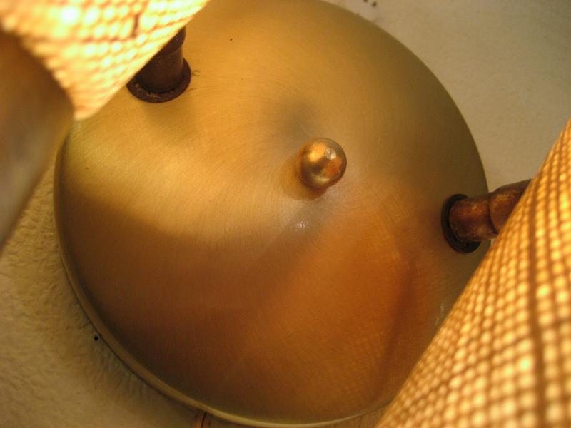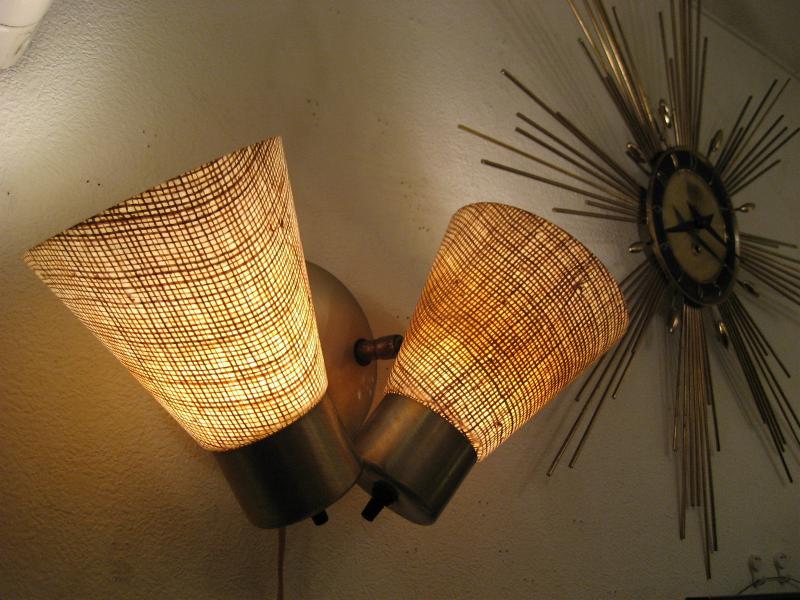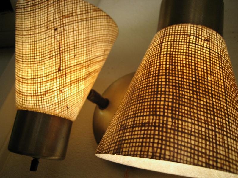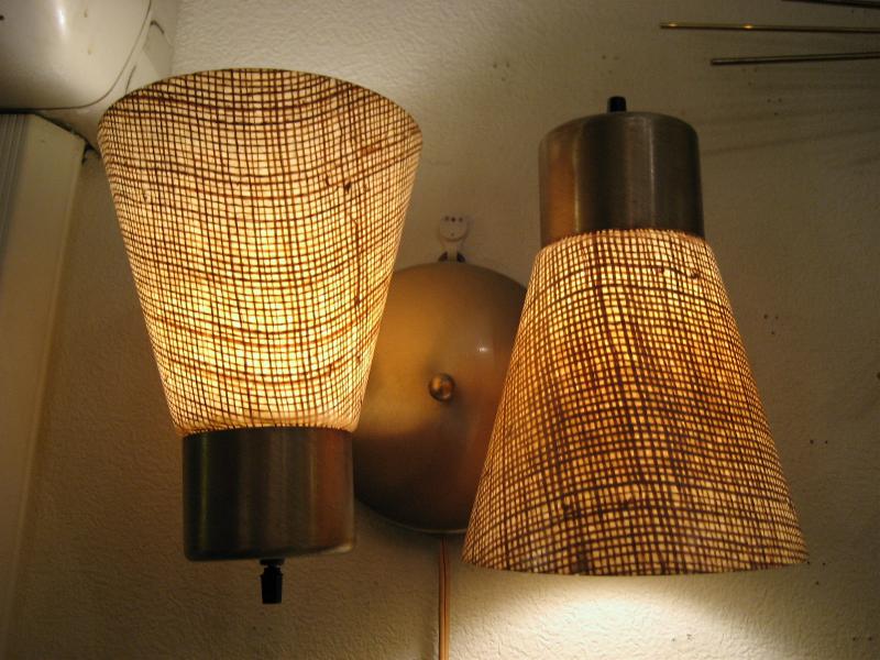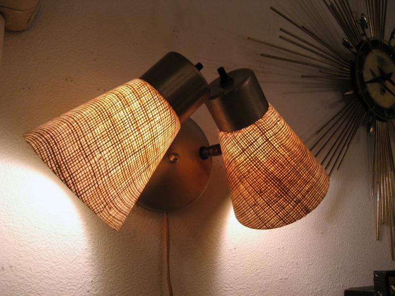 | ビンテージダブルシェードウォールランプ 50-60年代 USA 2スポットファイバーグラスシェードの壁掛けランプです。シェード方向は写真のように好みに合わせて可動しますので、いろいろなライティングシーンに対応できます。クールでGOODなライティングピース! 電源は家庭用コンセント対応でスイッチはランプそれぞれの後方に付いていてロータリー式(ON/OFF)です。 |