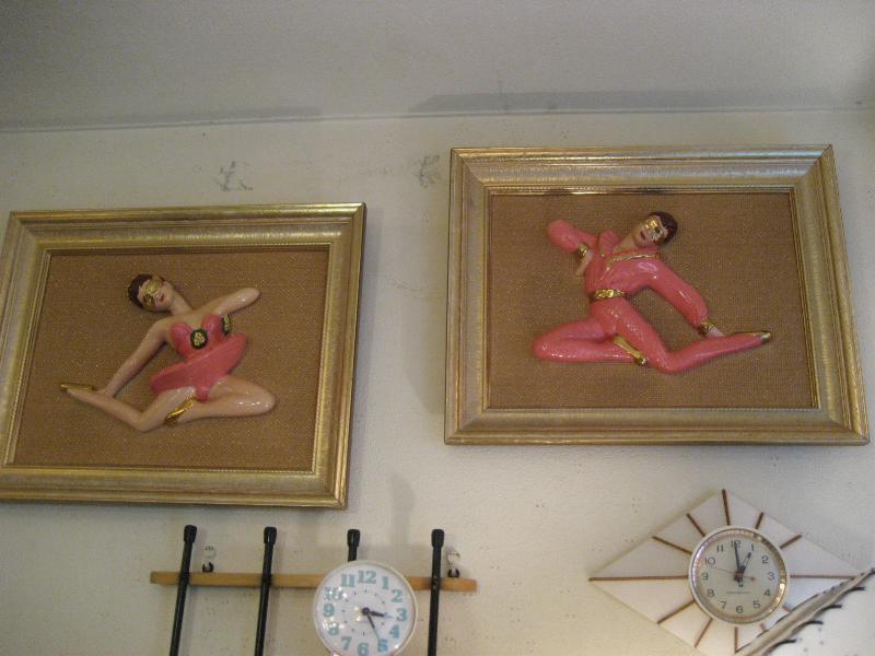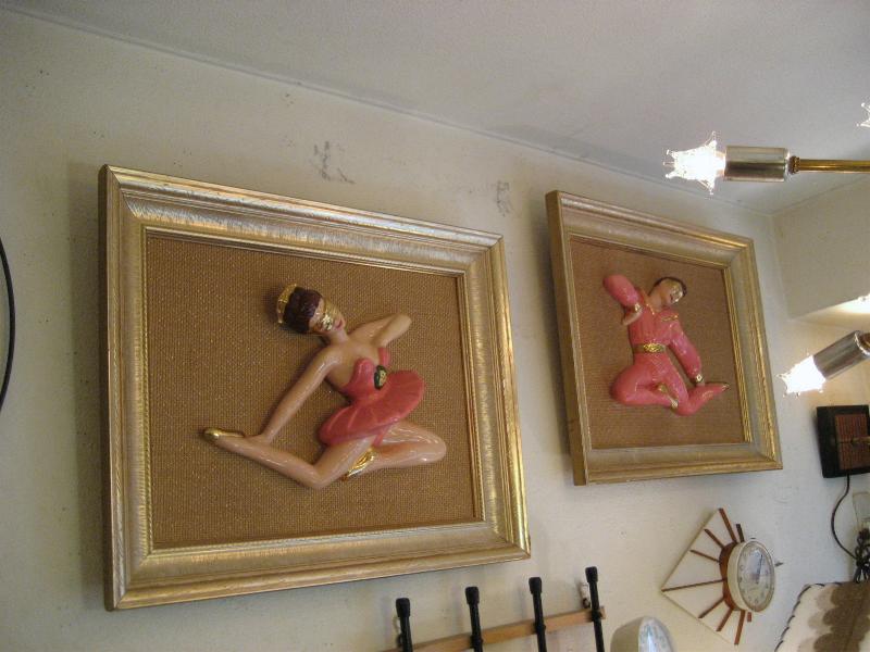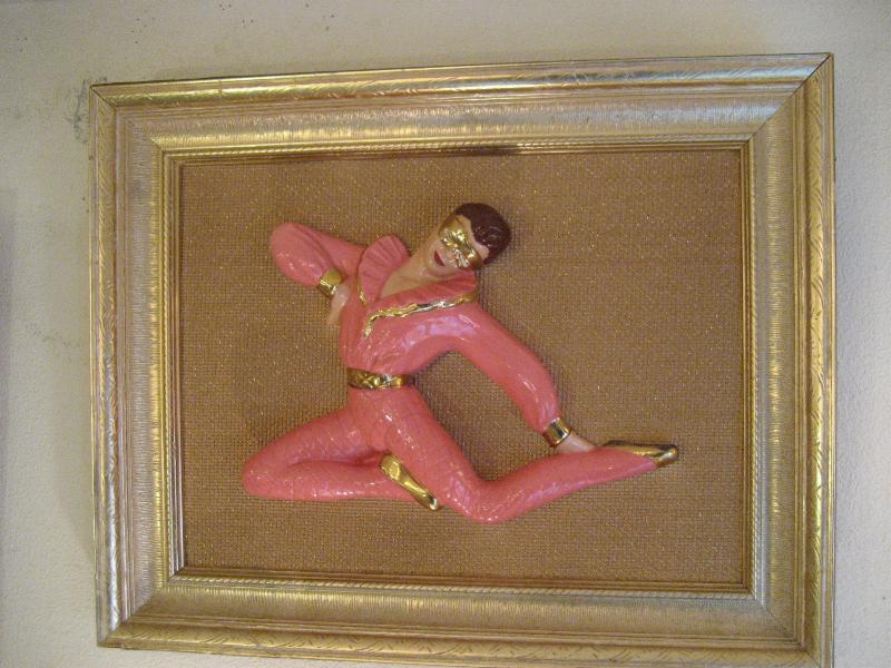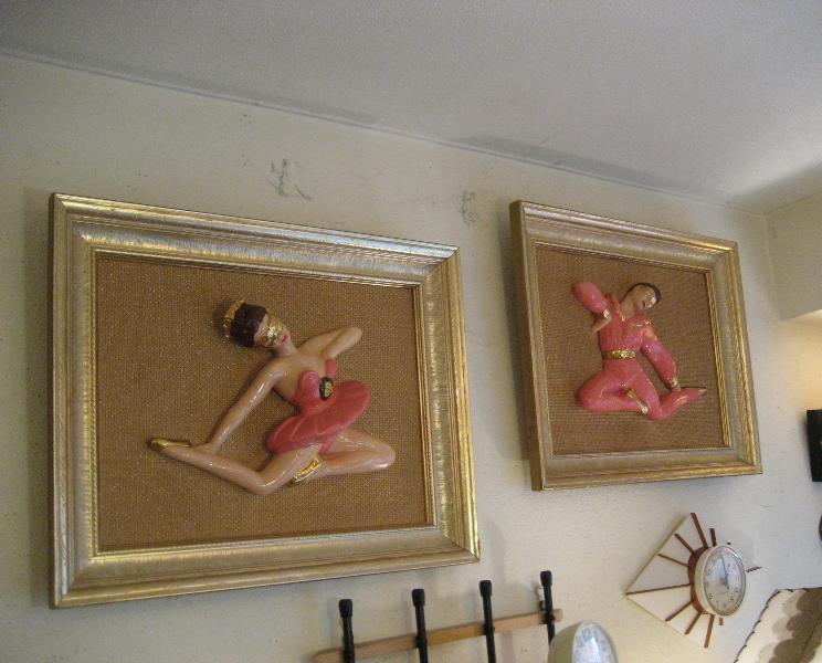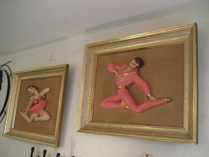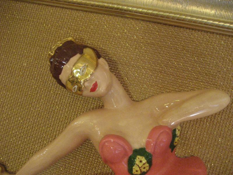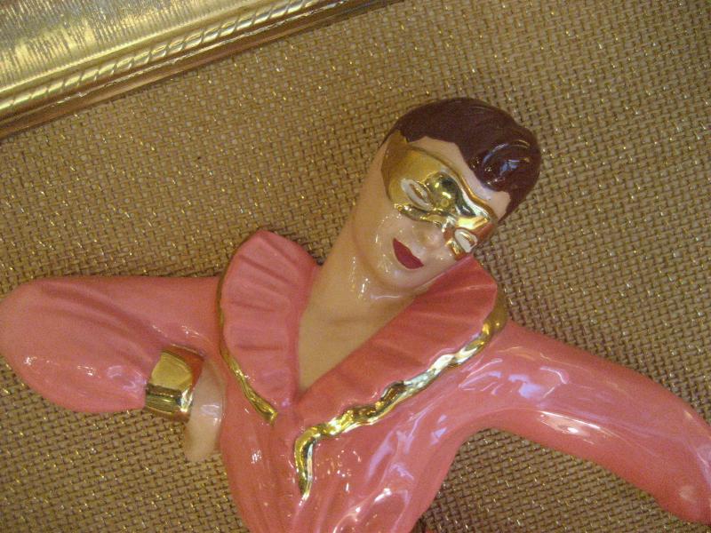 | ペアハーレクイン壁掛け 50年代 USA. ゴールドカラーのウッドベースフレームに陶器製ビンテージハーレクインのクールウォールデコ。ダンサーはピンクベースにゴールドアクセント。ビンテージウォールピース! |