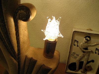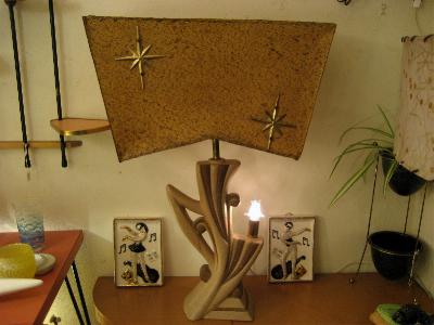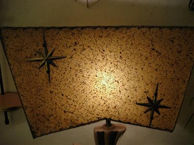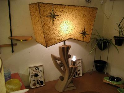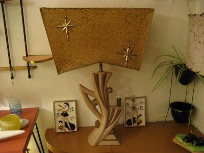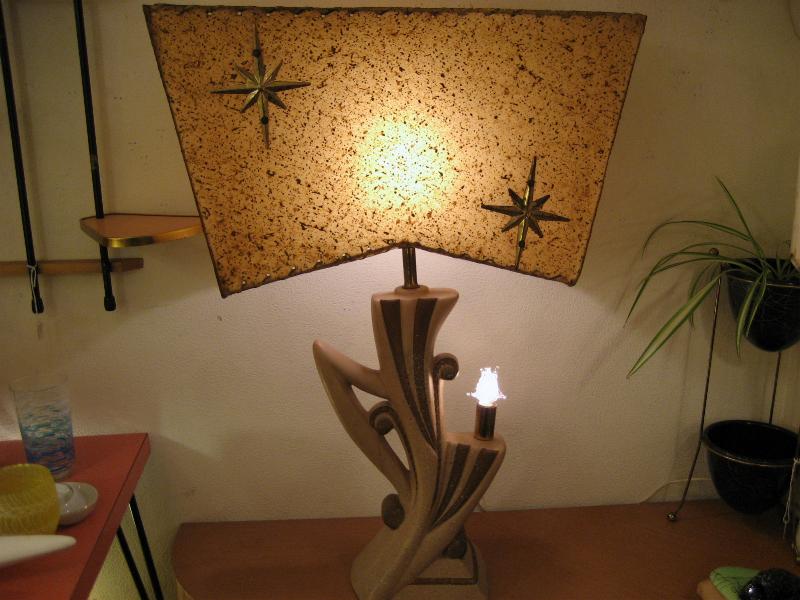 | アトミックシェードランプ / 50年代 USA スターライト球のスモールランプ付きアトミックシェードランプです。シェードは変形スクエアタイプでゴールドスターバーストデコレーションが2個付いたアトミックシェード!チョーク製のアトミックランプベース。電源は家庭用コンセント対応コードで、スイッチはランプソケット側面に付いています(3WAYタイプ)。 |