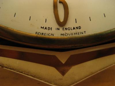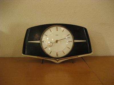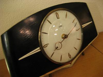 | アトミックデコシェルフクロック(置時計) / 50年代 METAMEC社, MADE IN ENGLAND. まるで50年代のアメ車のようなクールアトミックシェイプ置時計。ブラックのウッドボディにアイボリーとゴールドアクセント。 ムーブメントはバッテリー式(単3x1コ使用)に交換済ですので時間は正確です。 |