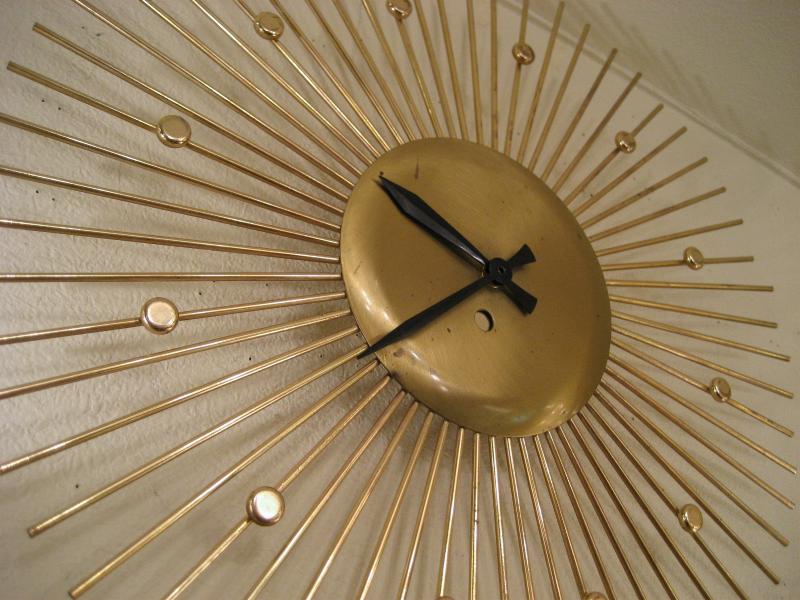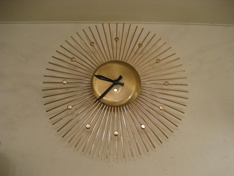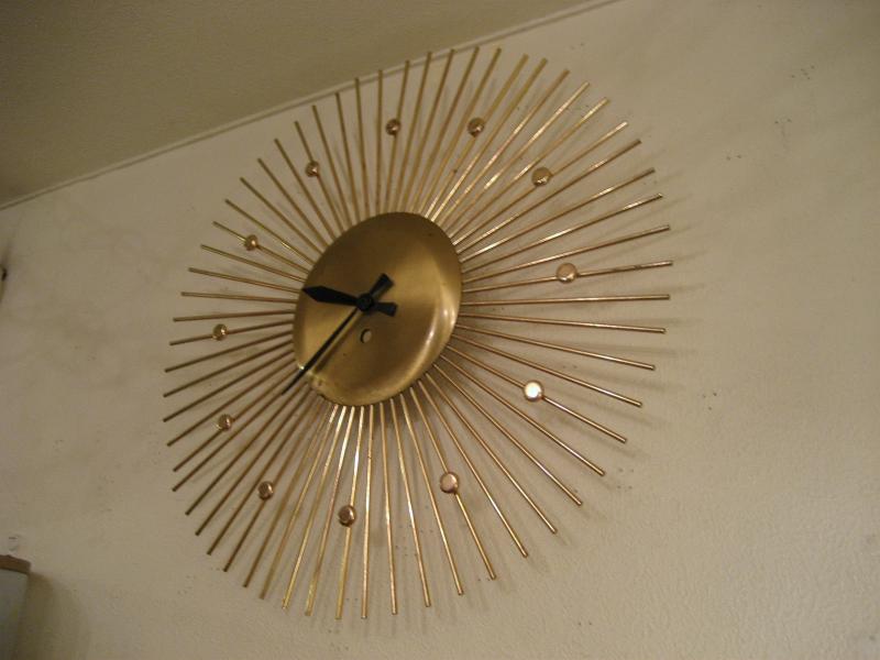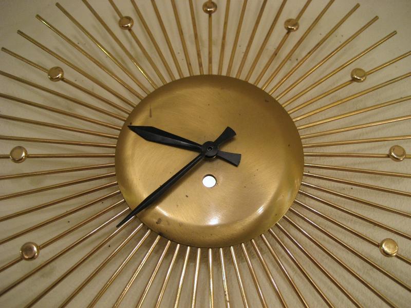 | サンバースト/スターバーストウォールクロック / 50-60年代 USA. ゴールドブラスのアトミックスポークフレームがクールなサンバーストタイプの壁掛け時計。文字盤無しでスポーク部分に円形の時間スポットが付いていて針はブラックハンド。シンプルかつクールなタイムピース! ムーブメントはバッテリータイプ(単3x1個使用)に交換済みですので時間も正確です。 |