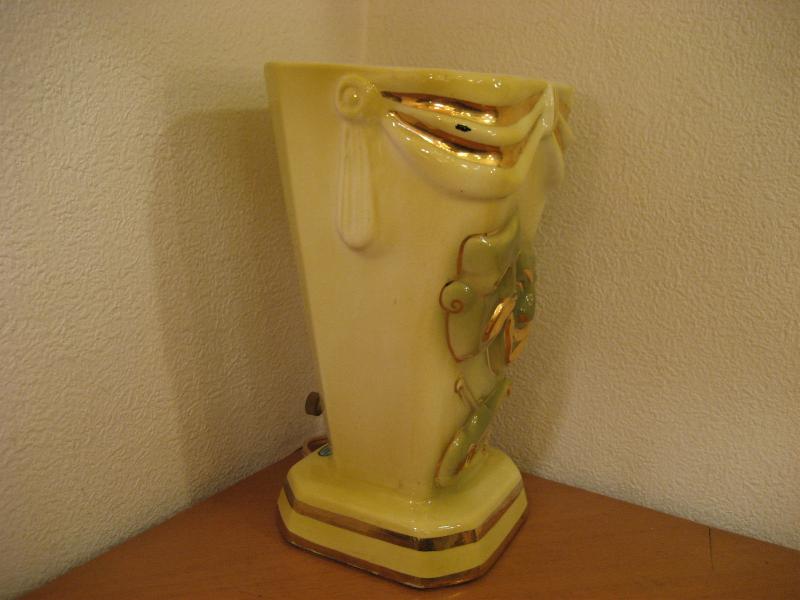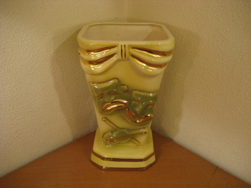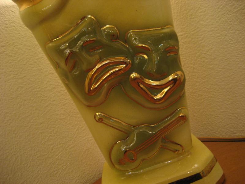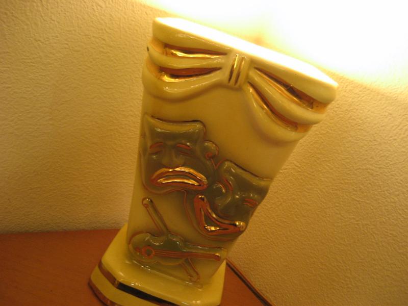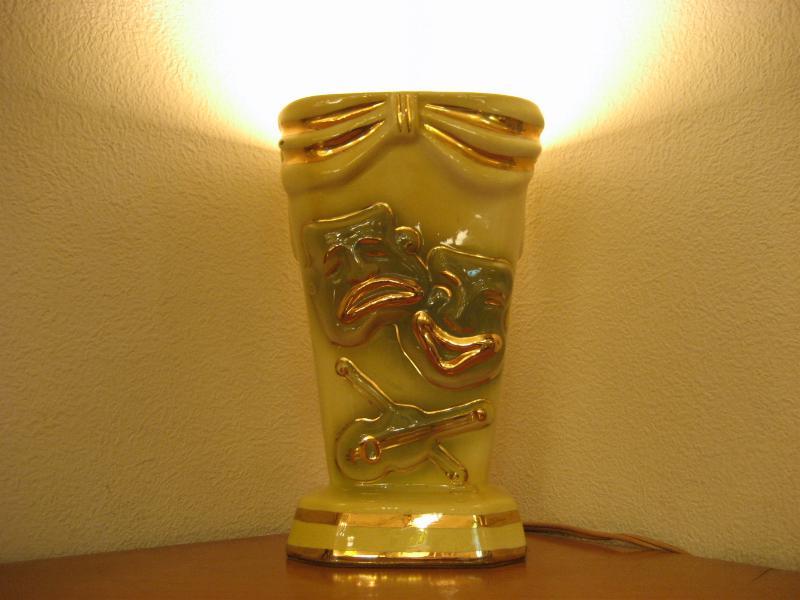 | ビンテージツーフェイスTVランプ / 50年代. 陶器製の泣き笑いモチーフTVランプです。ツーフェイスと楽器の絵柄でオリエンタルイエローグリーンにゴールドアクセント。プランターのようなフォルムで内側にランプソケットが付いています。電源は家庭用コンセント対応コードで、スイッチは本体後ろ側に付いています。 |