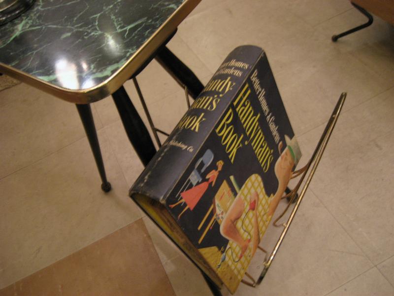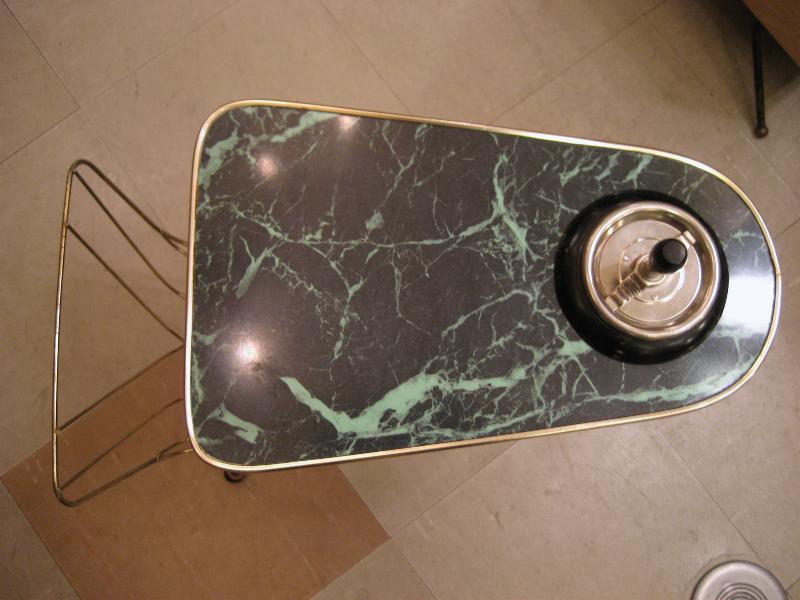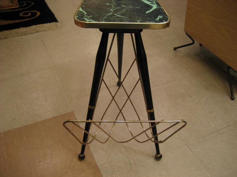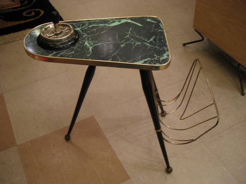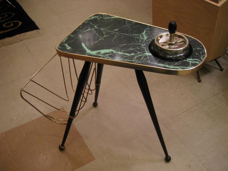 | アトミックスモーキングテーブル&マガジンラック / 50-60年代 スピニングアッシュトレイ付きのスモーキングテーブルです。サイドにゴールドワイヤーのマガジンラックが付いています。ブラックの3本レッグにアトミック絵柄の化粧合板テーブルトップ、天板サイドはゴールドモール仕上げで50'sテーブルの定番タイプ。もちろん灰皿は取り外し可なので吸殻などの処理も簡単です。 ソファやチェアサイド、お部屋が禁煙でしたらベランダなどにもGOODなクールフロアピース! |