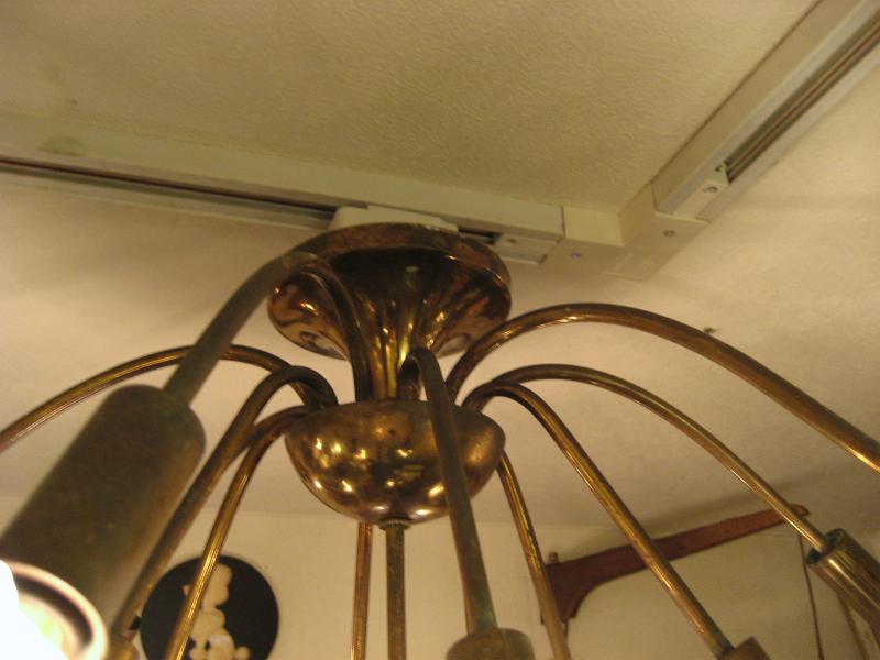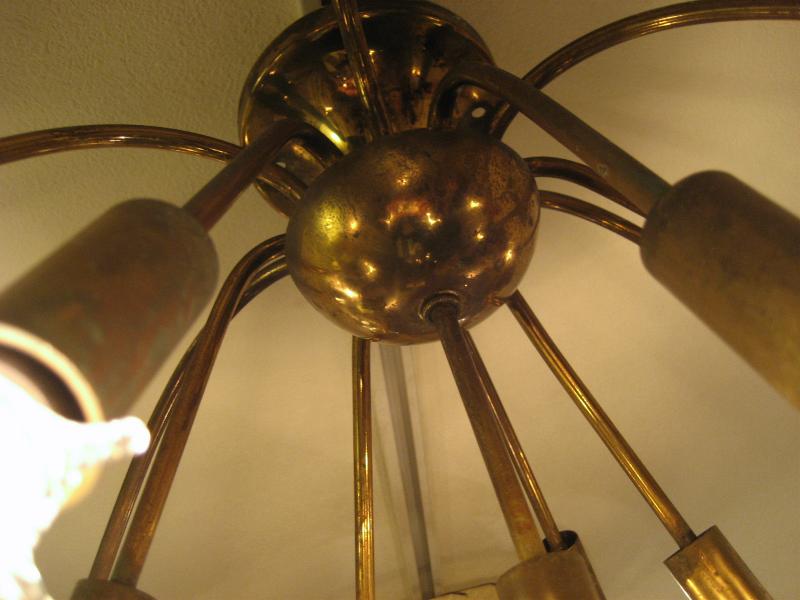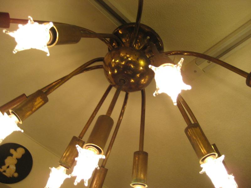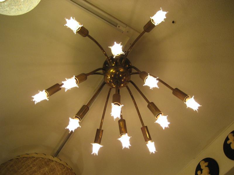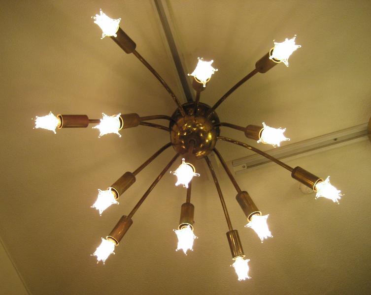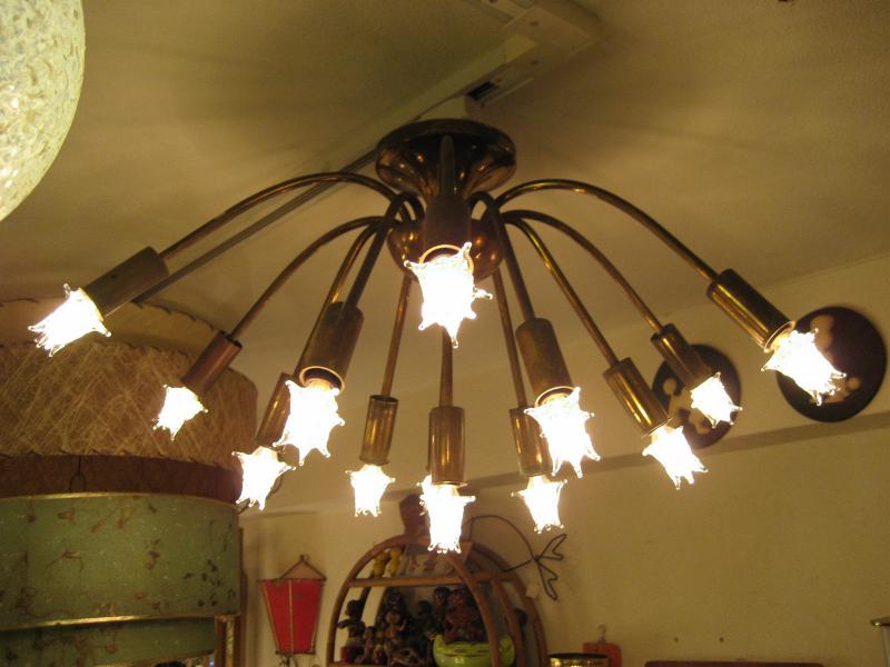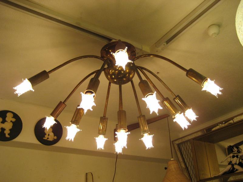 | ビンテージスプートニクシーリングランプ / 50年代 13発のシャンデリアタイプスプートニクです。センターの半円ベースの上側から12本のカービングアームとベース中心から真下へ出ている1本アームの組み合わせ。COOL&GOODなライティングピース! 電源は引っ掛けシーリングに交換済みですのですぐに設置可能です。 |