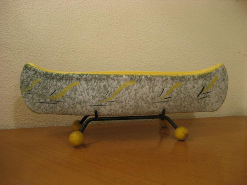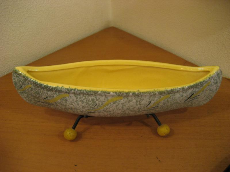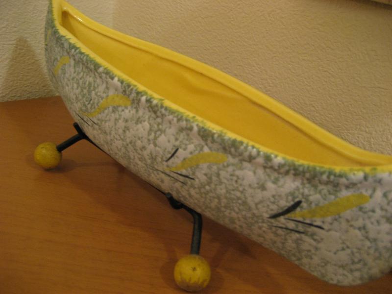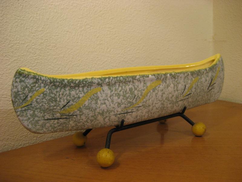 | アトミック TIKI プランター / 50-60年代 USA. 陶器製のカヌー?シェイププラントポットにブラックアイアンホルダーのビンテージシェルフプランター。ディスプレイにGOOD ! |
