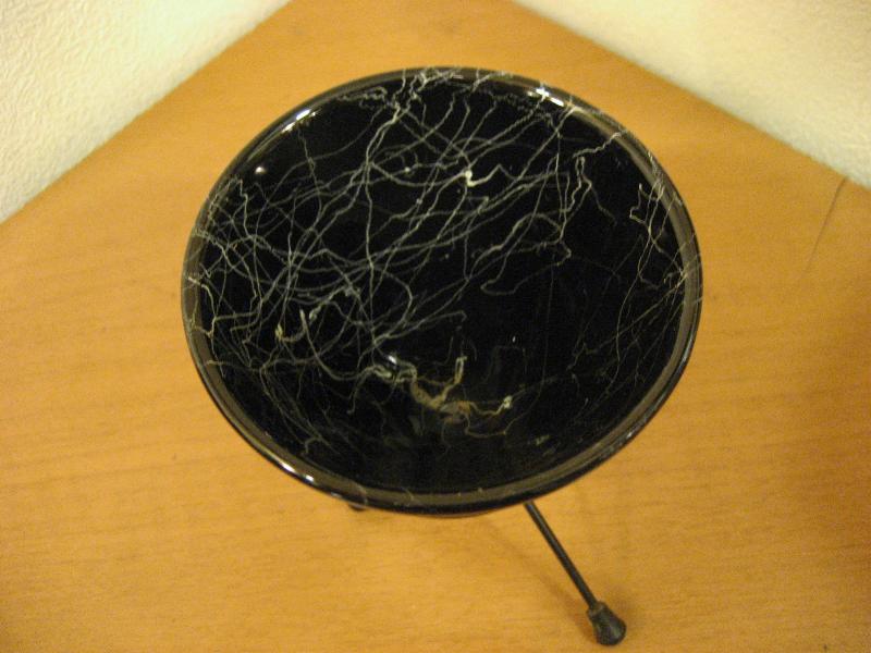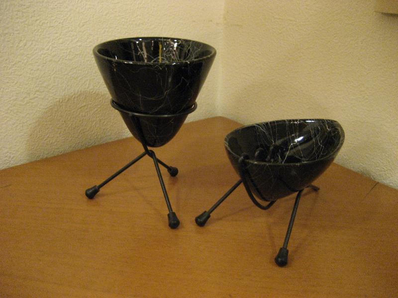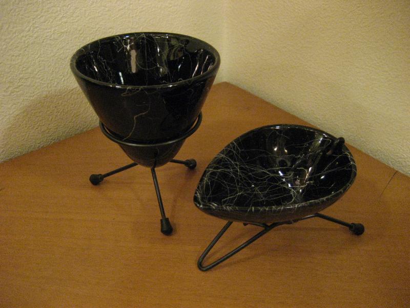 | ビンテージアトミックシガレットテーブルセット / 50年代 USA. シガレットホルダー・灰皿のペアセット。ブラックボディにホワイトラインの3本足タイプ。とてもクールでアトミックなセット!タバコなんか吸わなくてもオブジェとしてもGOOD! |
