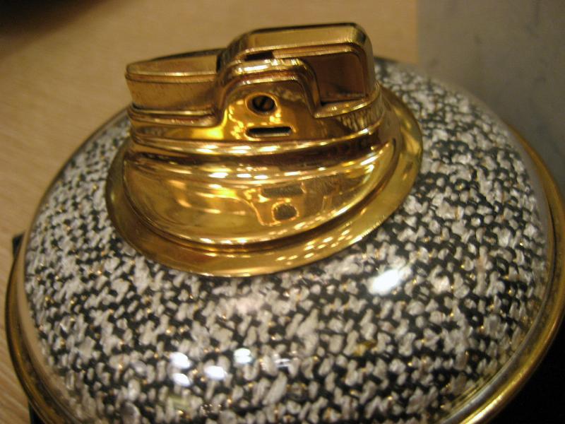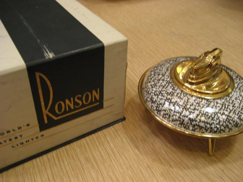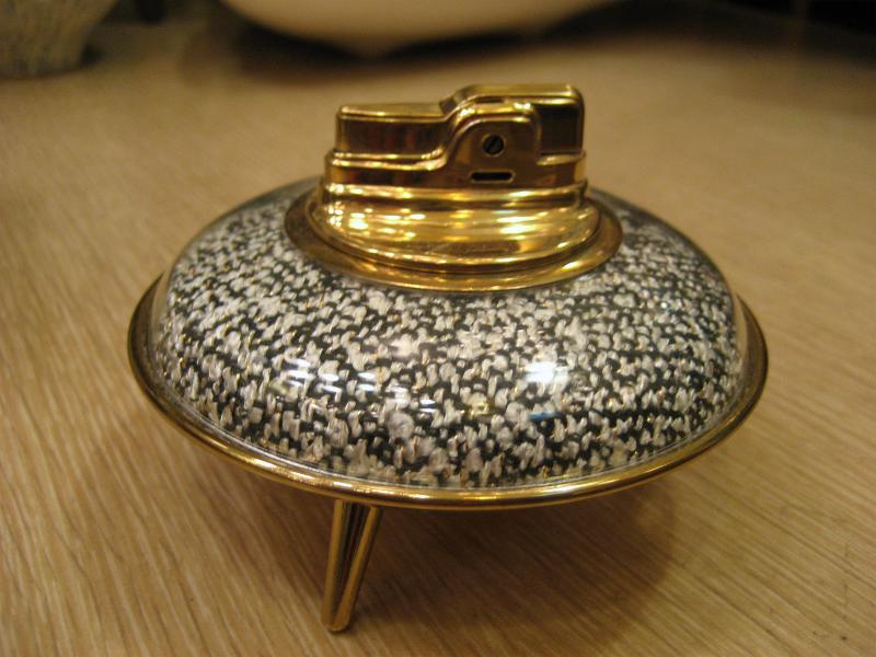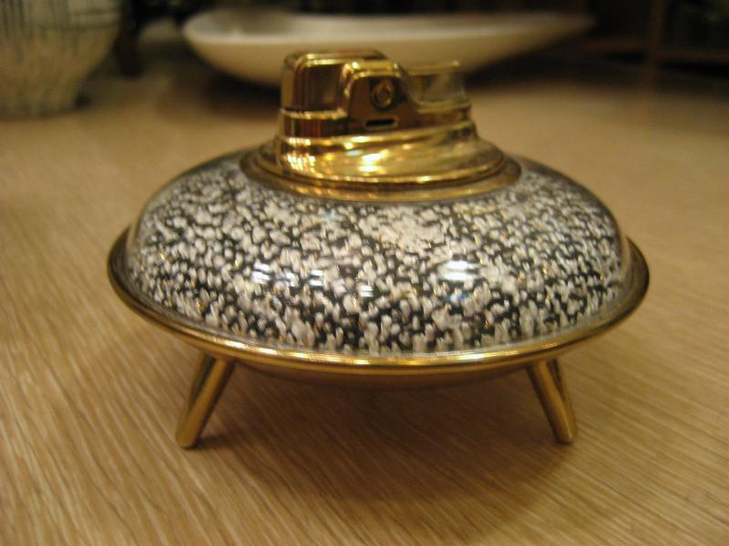 | ビンテージアトミックテーブルライター / 50年代 デッドストック オリジナルBOX付 ロンソンのテーブルライターで箱付きデッド(未使用)です。アトミックな3本足タイプでベースカラーはゴールド、上の柄部分は透明部の内側にファブリックがはめ込まれているようです。タバコを吸わない方でもディスプレイとして欲しくなるクールなテーブルピース! |