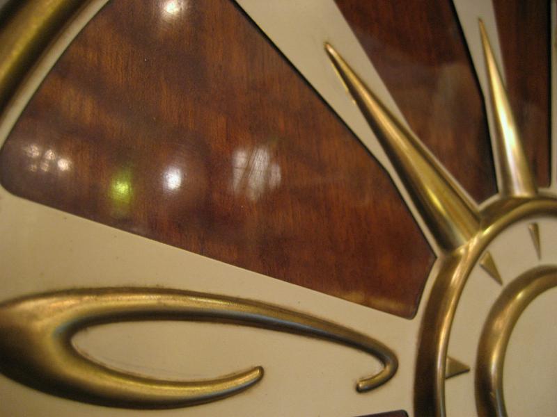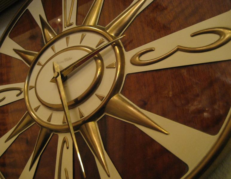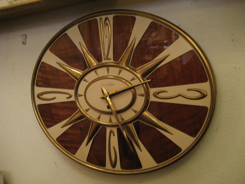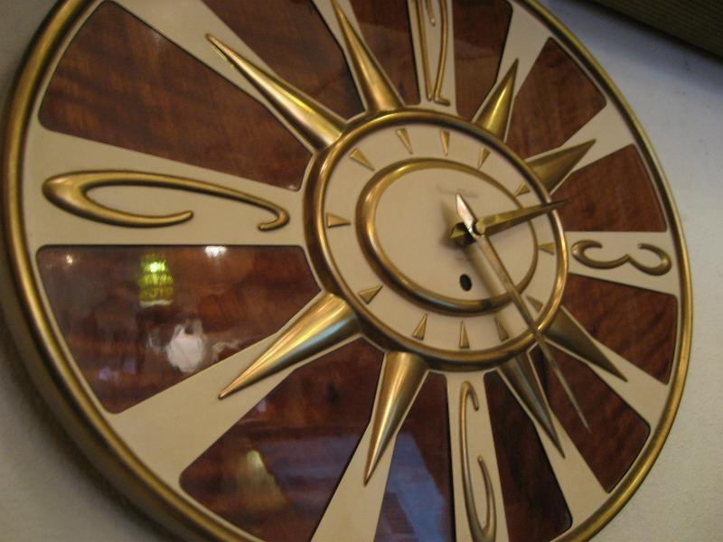 | スターバーストウォールクロック / 50-60年代 USA. Phinney Walker社製。オーバルシェイプにインサイドスターバーストタイプ壁掛け時計。ディティールはウッドベースにメタル製の型抜きフレーム、オリジナルゴールドハンド。クールモダンなタイム&ウォールピース! ムーブメントはバッテリータイプ(単3x1個使用)に交換済みですので時間も正確です。 |