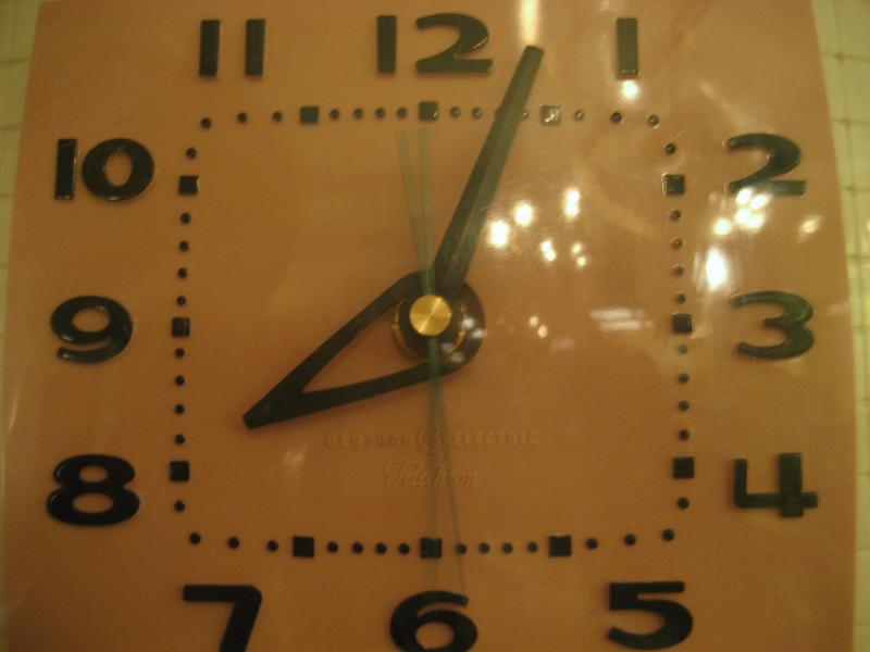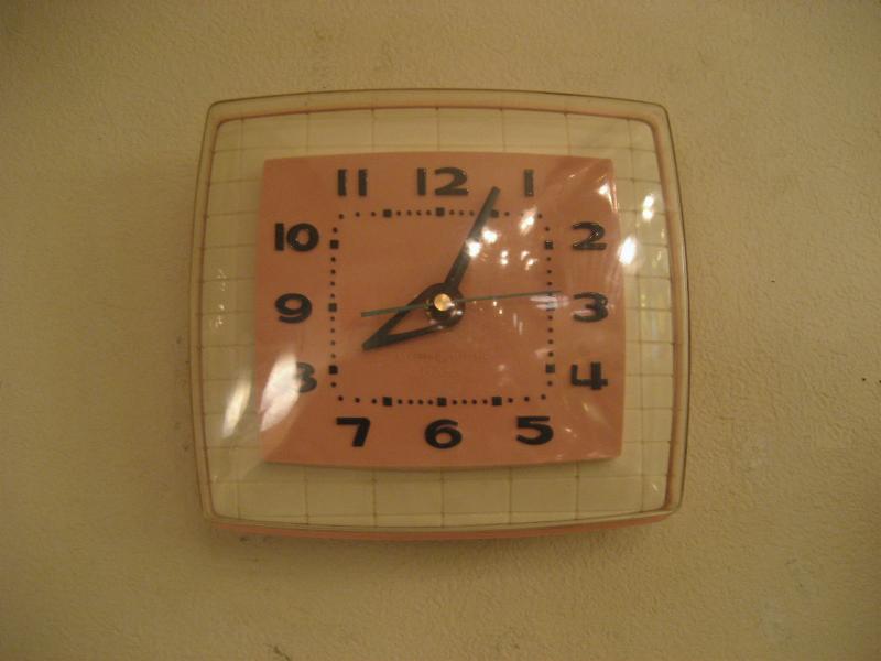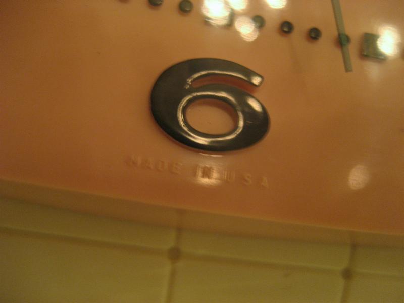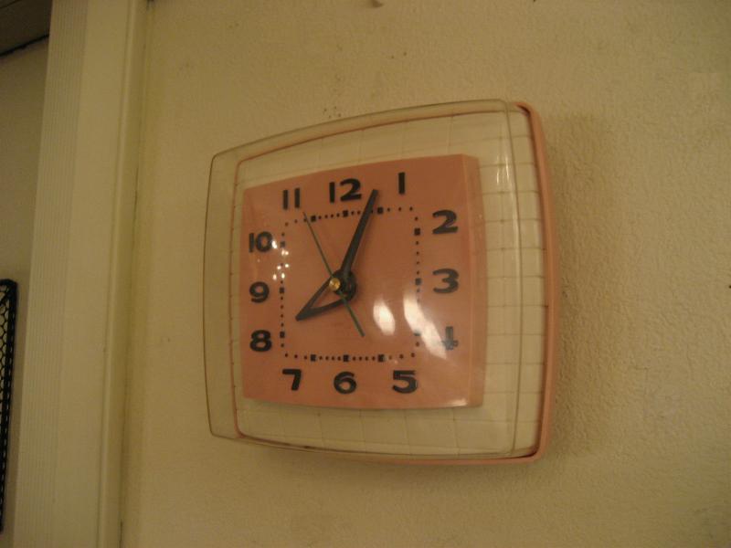 USA. クールでキュートなピンクベースのカラーリングがGOODなビンテージキッチンクロック。ムーブメントはバッテリー式(単3x1コ使用)に交換済ですので時間は正確です。 |