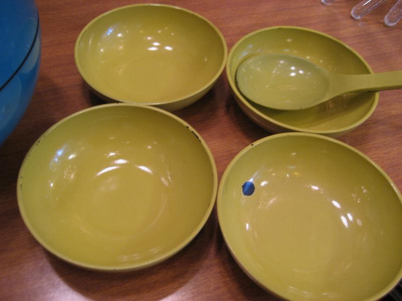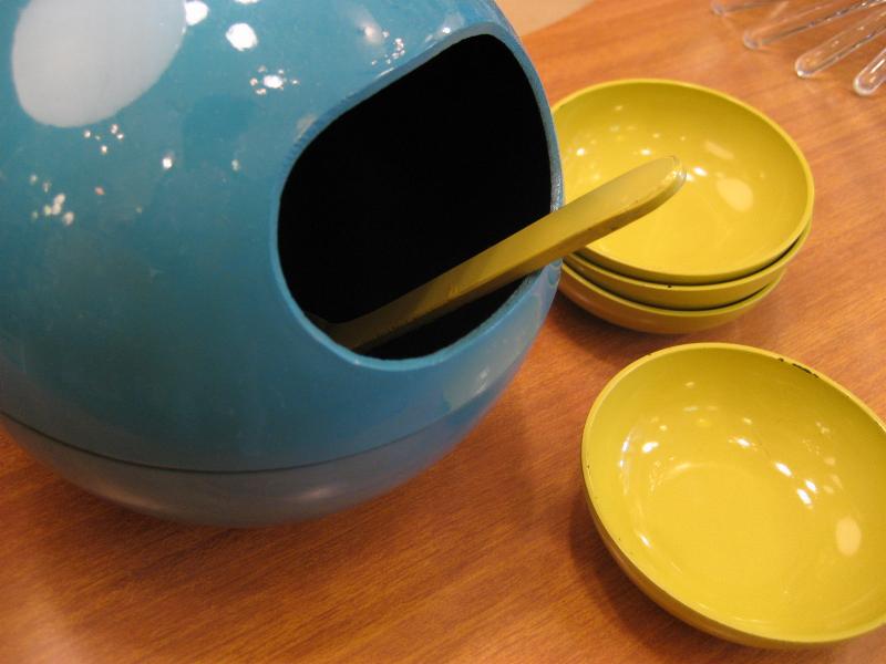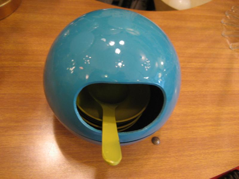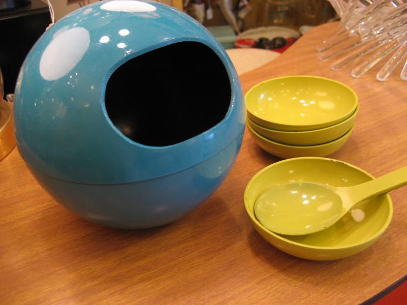 | アトミックサーヴィングボウル/トレー&スプーンセット 60-70年代 USA. かなりスペーシーなデザインのテーブルセット(ボウル1個、トレー4枚、スプーン1本)。プラスチックメイドで質感がやはり現代のものと違って雰囲気いいです。 本来はキャンディなどのサーヴィングセットに使われていた物のようです。。。が、使い道は自由ですのでいろいろ考えてみてはいかがでしょうか・・・ ディスプレイ性も高くカラーリングもキュートなGOODピースです! |