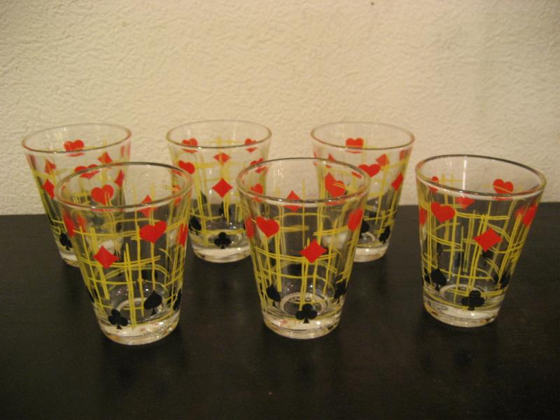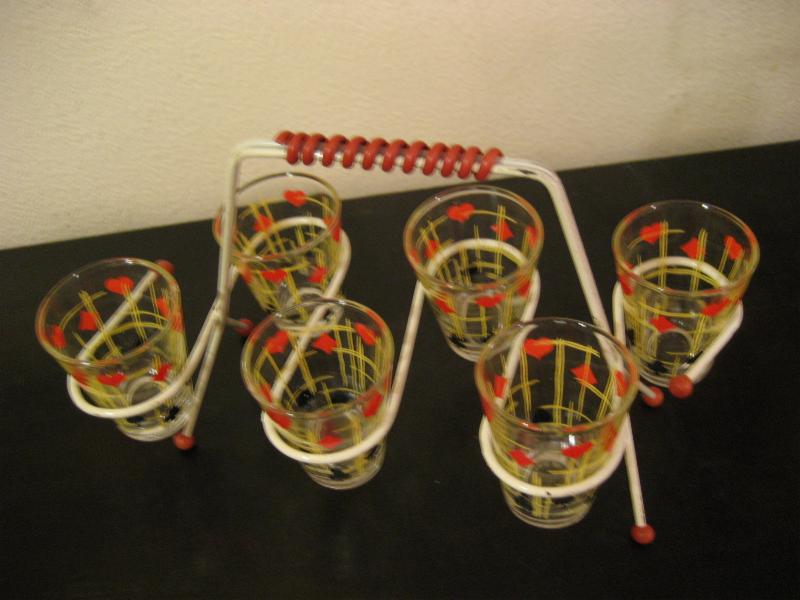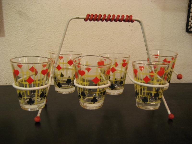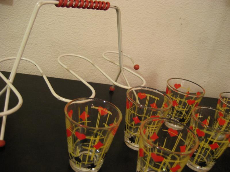 | アトミックショットグラスセット / 50年代 USA. トランプマーク絵柄がクールなショットグラス6個とマッチングラックのセットです。アトミックなデザインのラックがクール&キュート!ディスプレイにもGOODなテーブルピースです! |