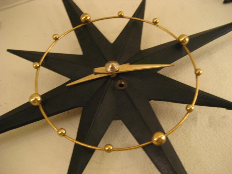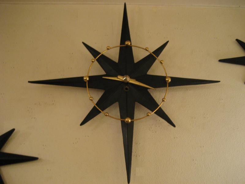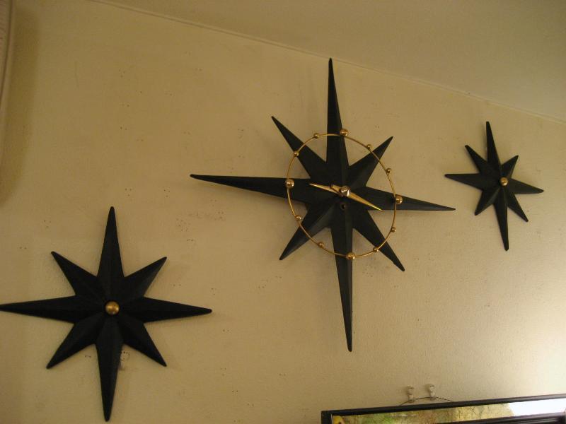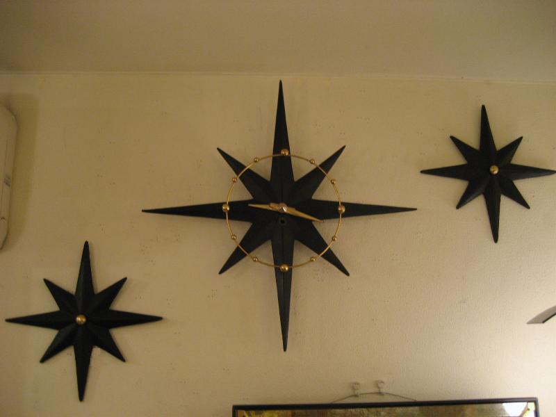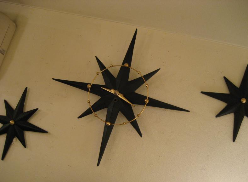 | ビンテージスターバーストクロック&ウォールデコ / 50年代 USA. スターバーストタイプのアトミック壁掛け時計と壁飾りの3pcセットです。ボディはプラスチック製でダイヤルはゴールドブラスのアトミックワイヤーフレームと時間のゴールドスポットアクセント。ウォールデコも時計ボディと同素材でセンターにゴールドブラスアクセント付き。時計のムーブメントはバッテリータイプ(単3x1個使用)に交換済みですので時間も正確です。 |