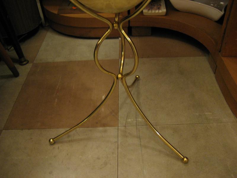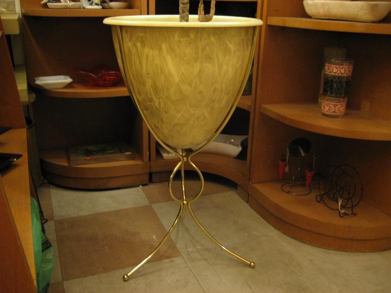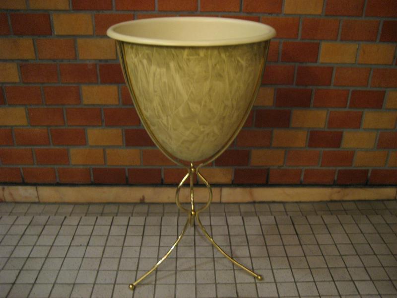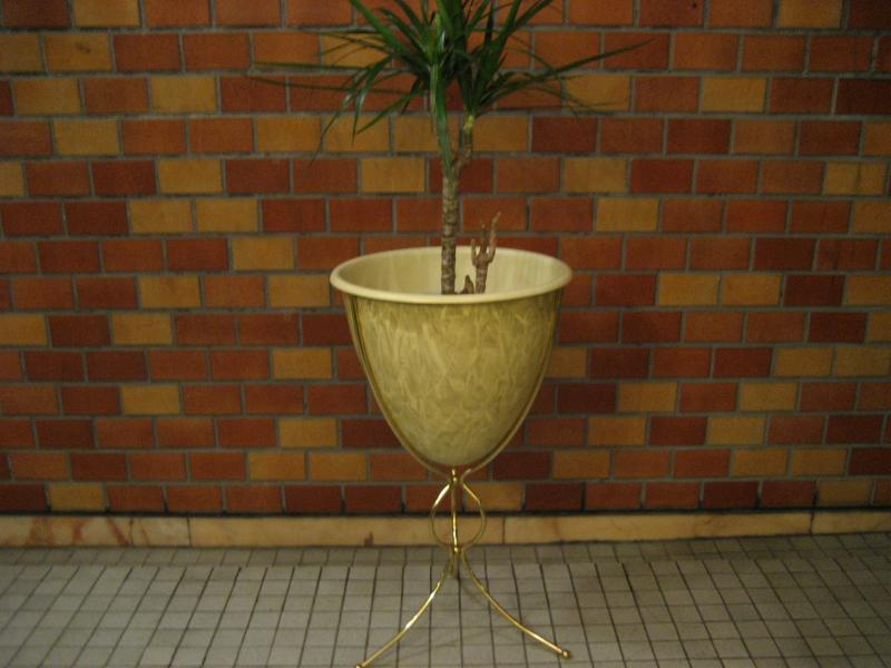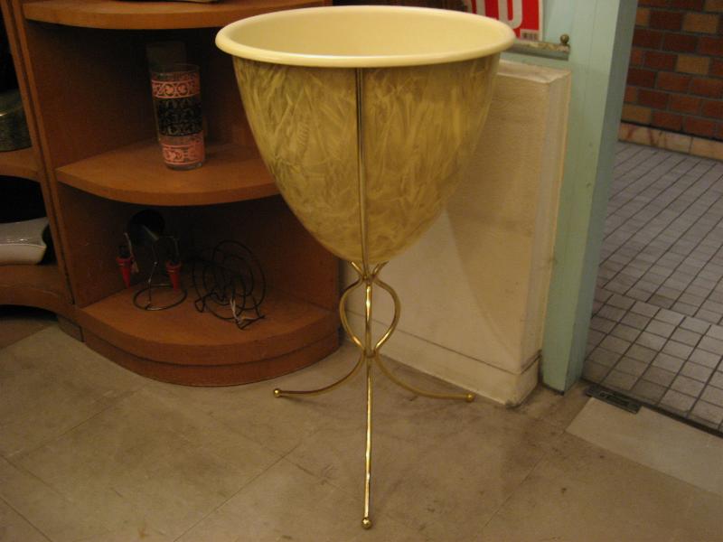 | ビンテージアトミックプランター / 50-60年代 USA. アトミックシェイプのゴールドブラスフレームスタンドにプラスティックポット。ポットの柄はベージュベースにくすんだゴールドのアトミック絵柄。フロアディスプレイにGOODなミッドセンチュリーピース! |