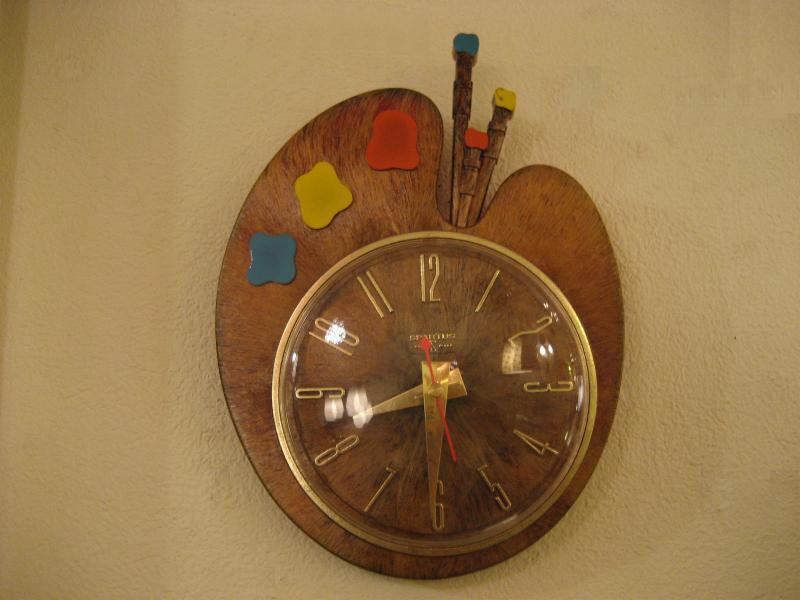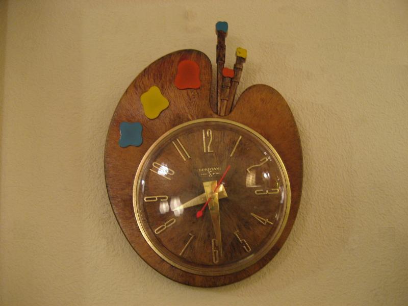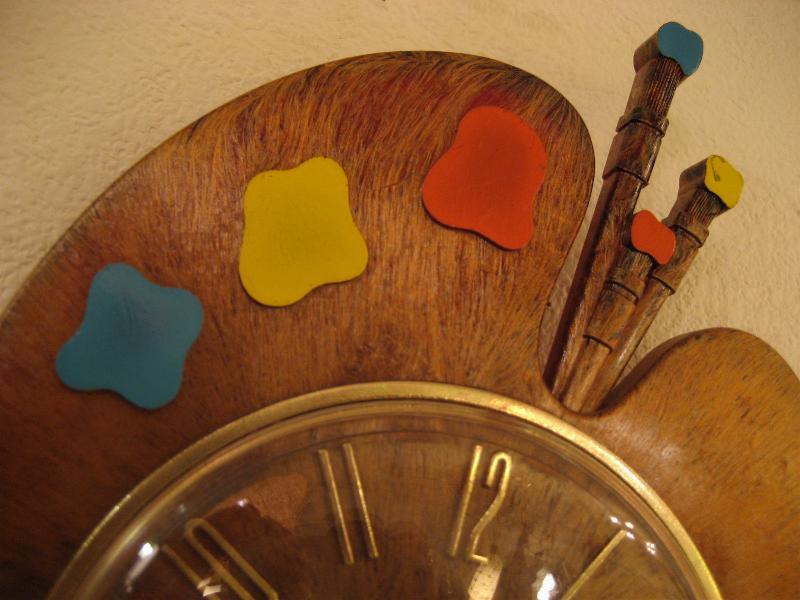 | ビンテージウォールクロック / 60年代 SPARTUS社, MADE IN USA. キュートなパレットシェイプのビンテージキッチンクロック。プラスチックボディで木目調仕上げになっていて、3色の絵の具と絵筆もアクセントされています。キッチンやキッズルームなどにGOODなウォールタイムピース! ムーブメントはバッテリー式(単3x1コ使用)に交換済ですので時間は正確です。 |