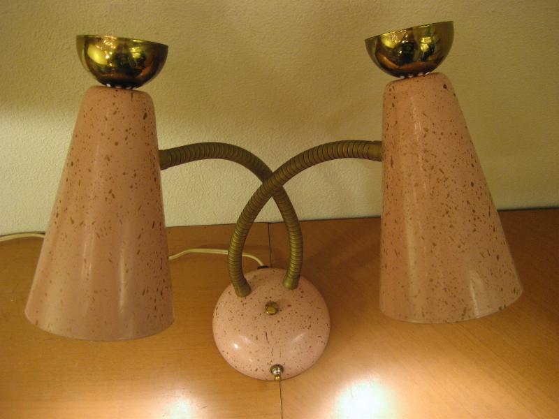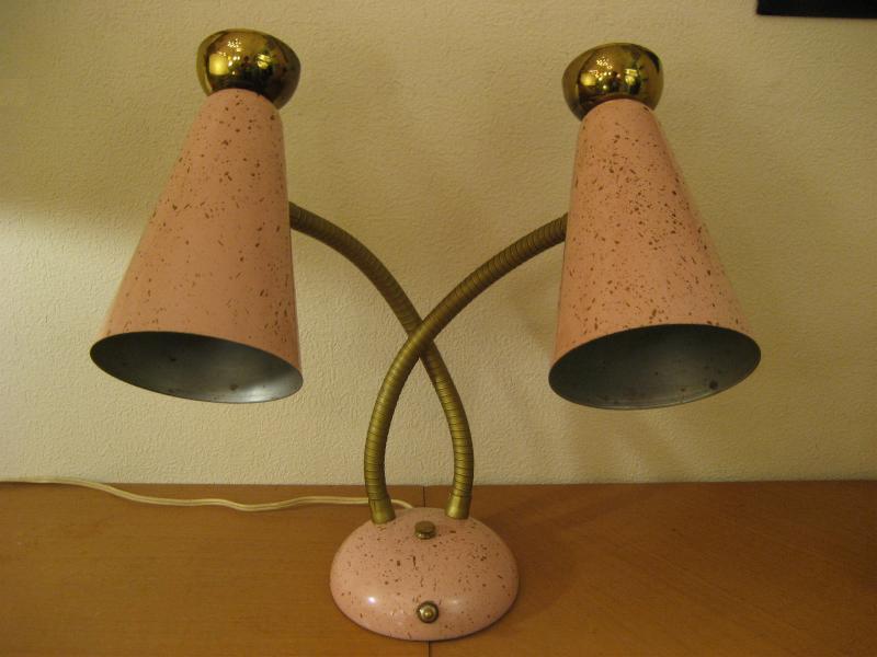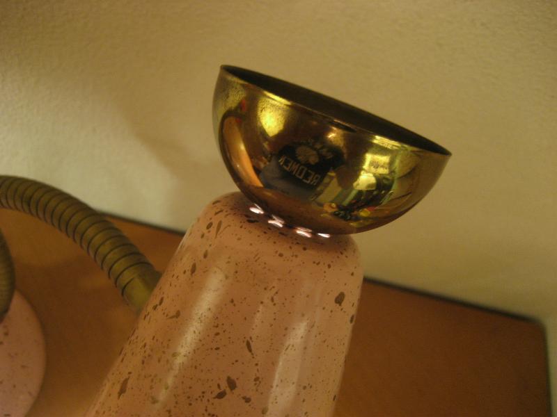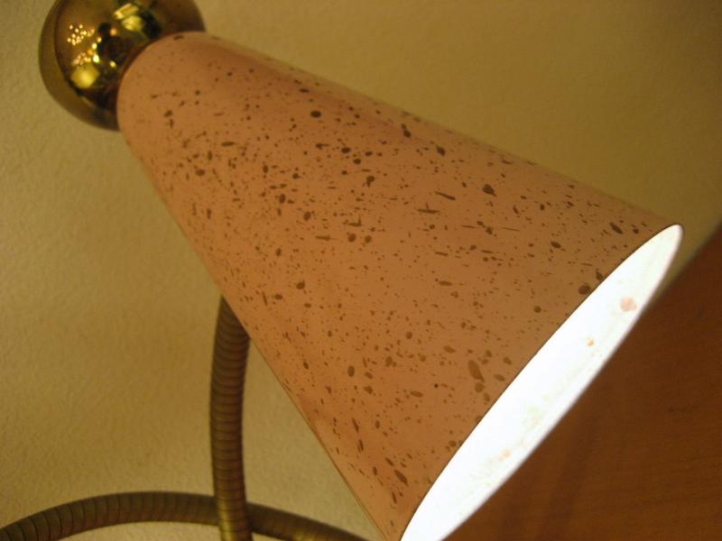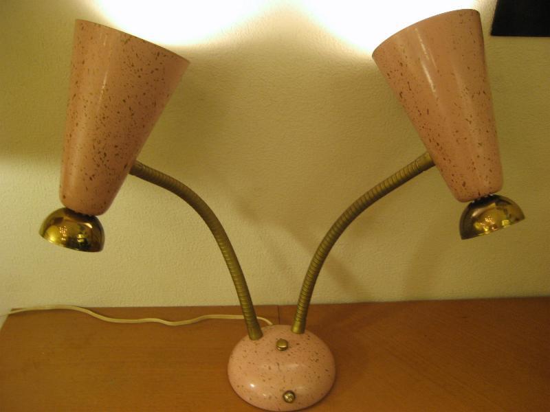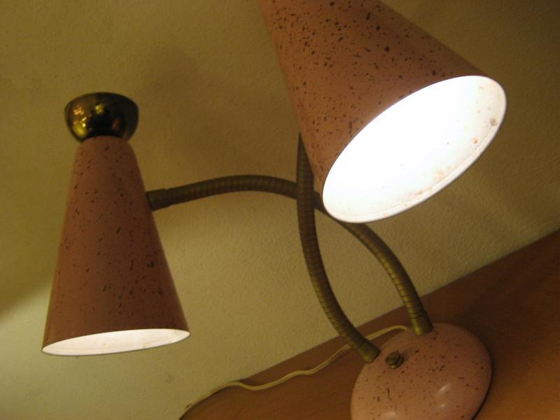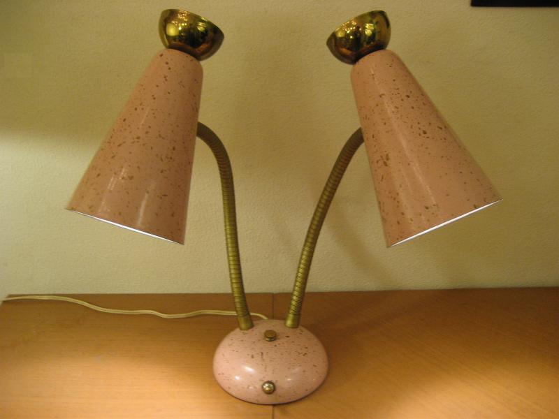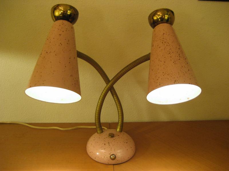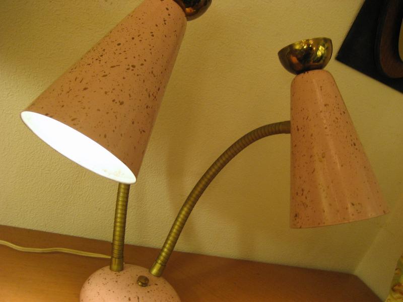 | アトミックテーブルランプ / 50年代 USA. ピンク&ゴールドカラーのダブルシェードランプ。フレシキブルアームですのでポジションも自在!メタルシェード後部のゴールドデコレーションがクールなアトミックライティングピースです! 電源は家庭用コンセント対応コードで、スイッチはベースに付いています(3 way) |