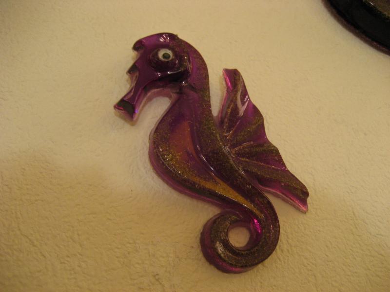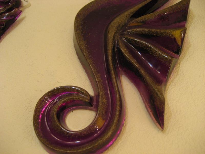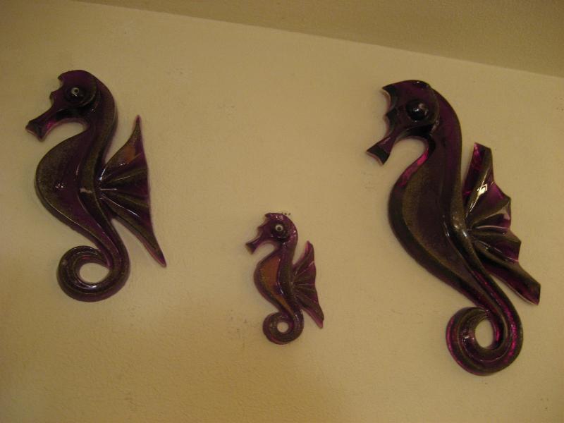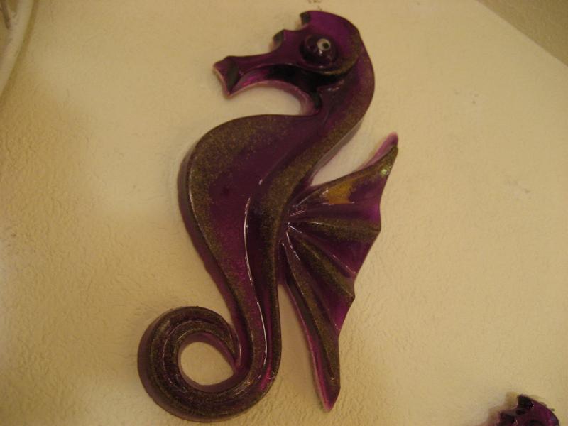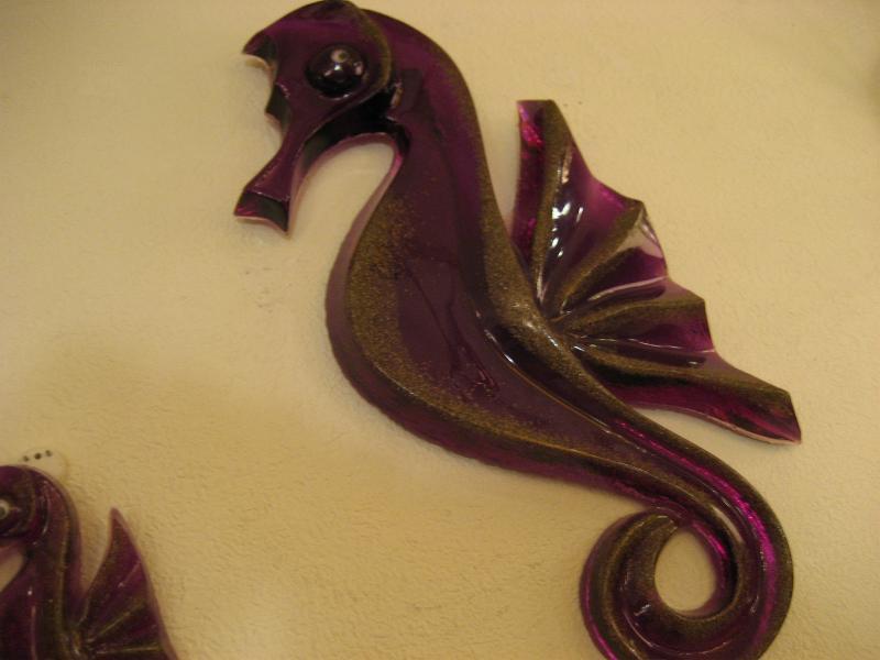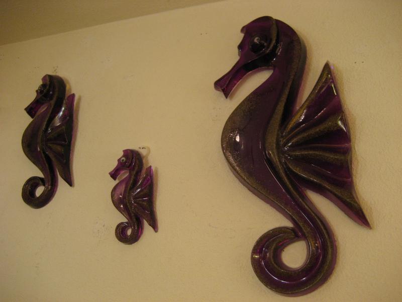 | ビンテージシーホースウォールデコ / 50-60年代 USA アクリル樹脂メイドのタツノオトシゴ壁掛け3pcセットです。ダークパープルにゴールドアクセントカラー。キュート&クールなGOODウォールピース! |