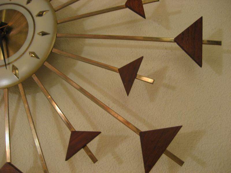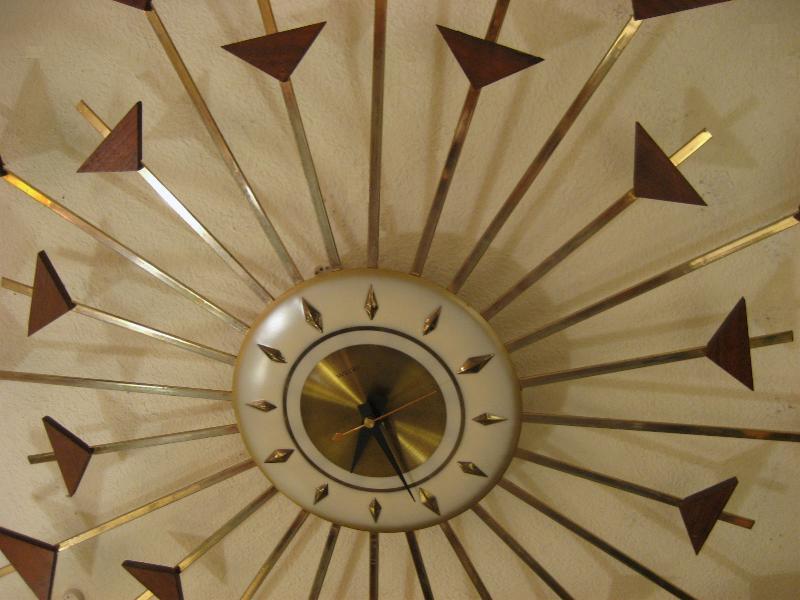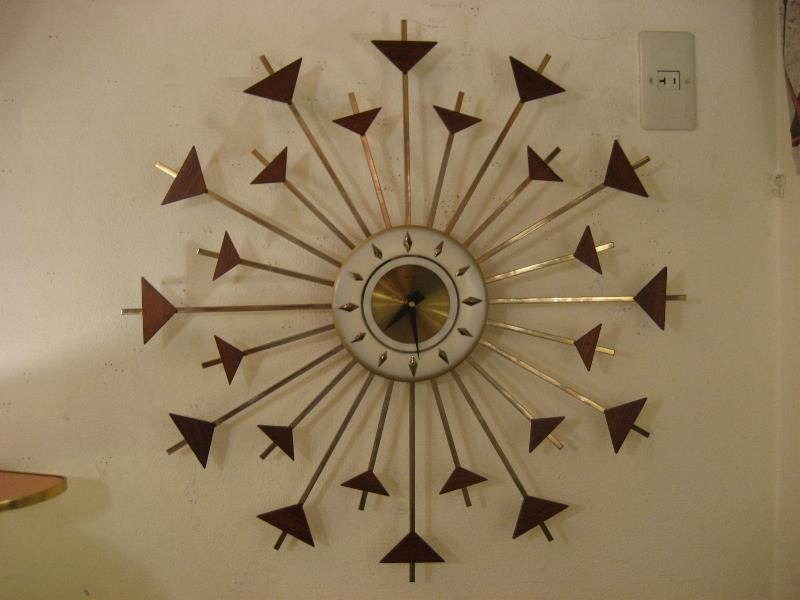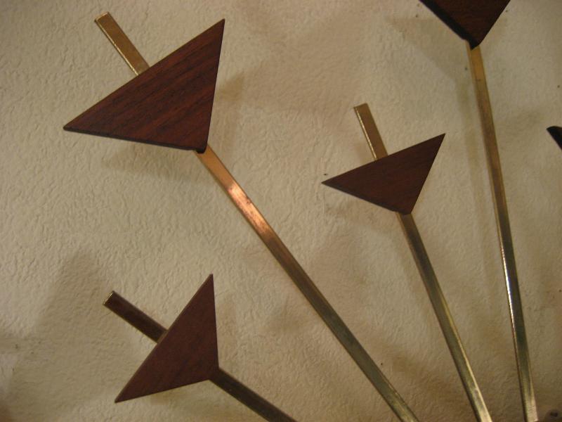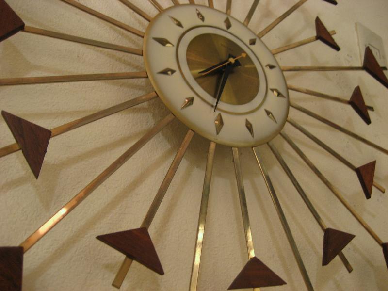 | ビンテージスターバーストクロック / 50-60年代 ウェルビー社製 USA. 24本のスーパーアトミックスポークにウッドデコのフレームがクールなスターバーストまたはサンバースト壁掛け時計。ウェルビー社の得意とするメタル&ウッドのコンビネーションデコ。時計のムーブメントはバッテリータイプ(単2x1個使用)で時間も正確です。 |