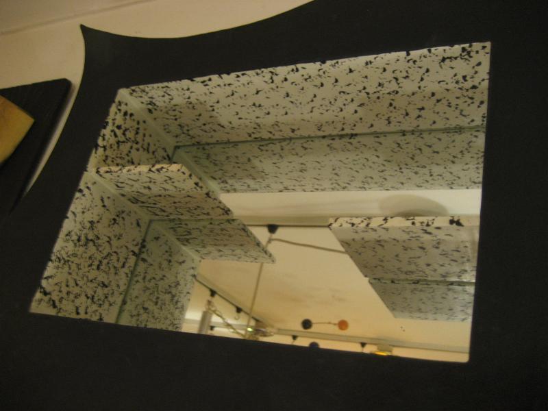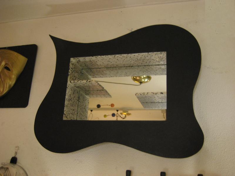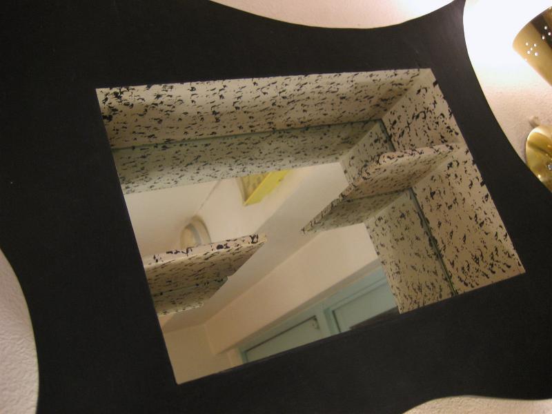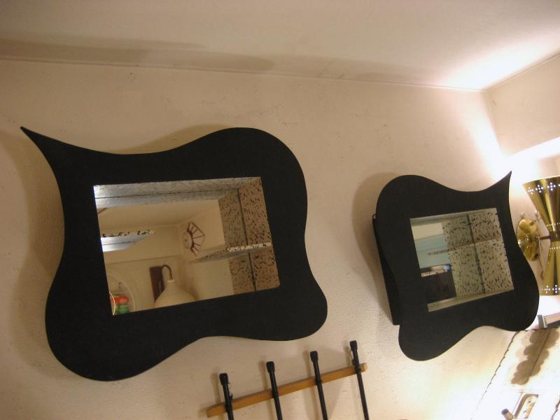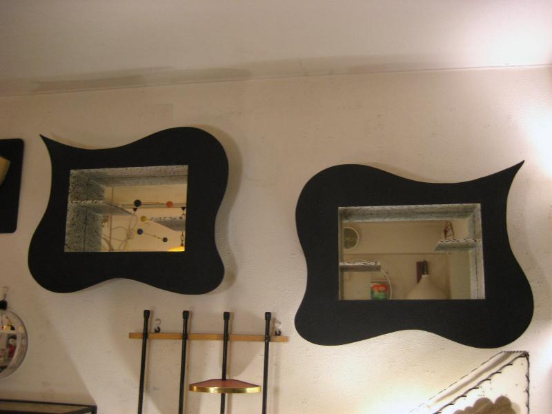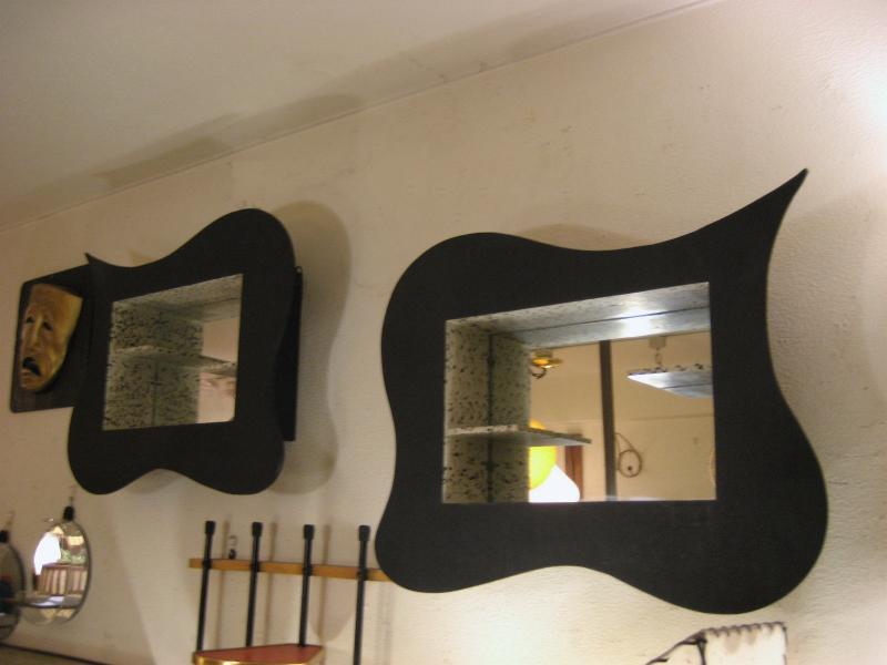 | ペアアトミックシャドウボックスウォールシェルフ / 50年代 USA ミラーバックタイプウォールシェルフセット。アトミックなブーメランシェイプにインサイドはアイボリーカラーにブラックフレークアクセントカラー。それぞれ2段の違い棚付き。置物などのディスプレイにGOODなクールウォールピース! |
