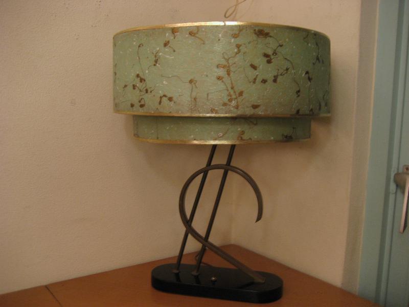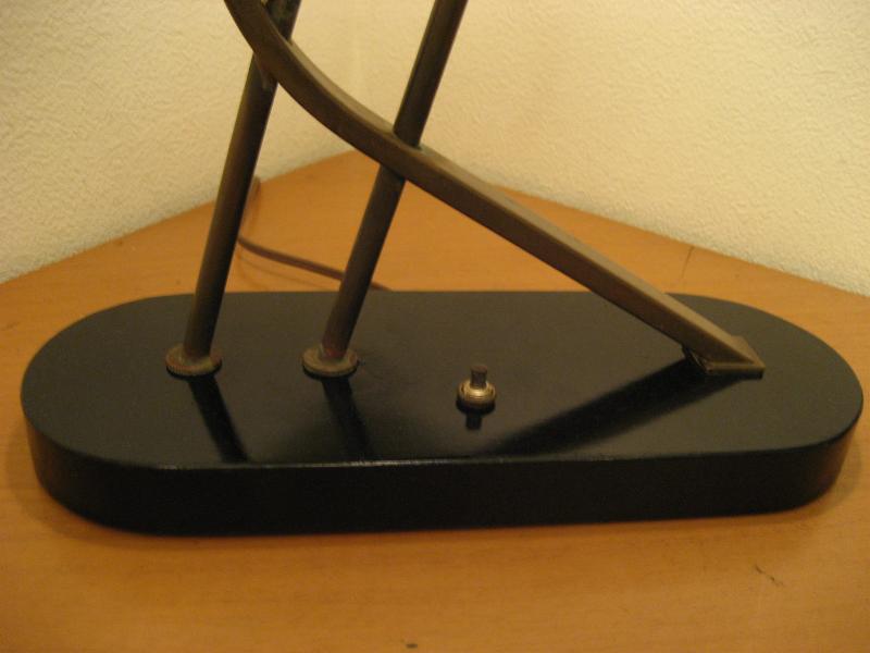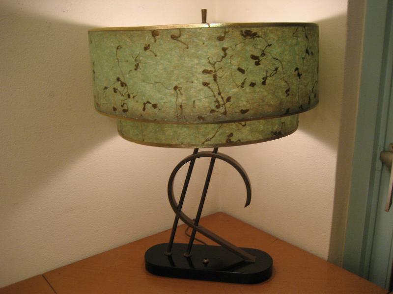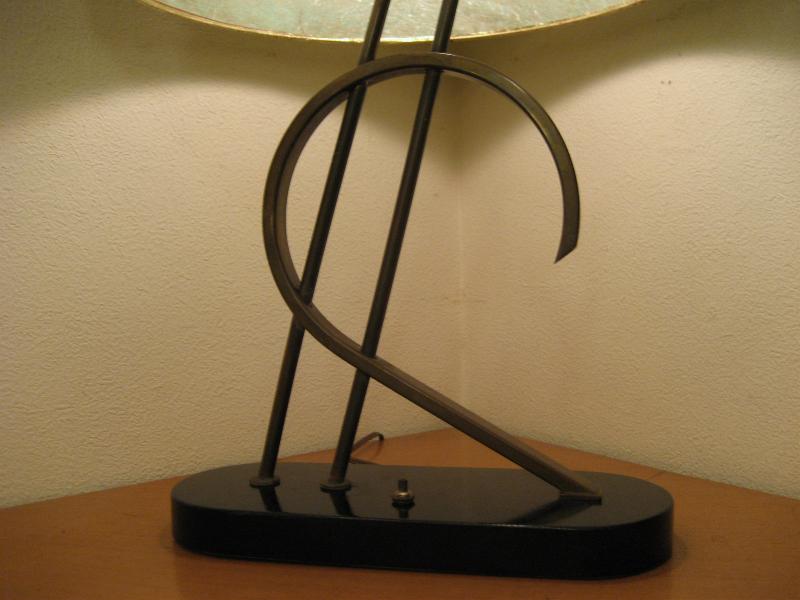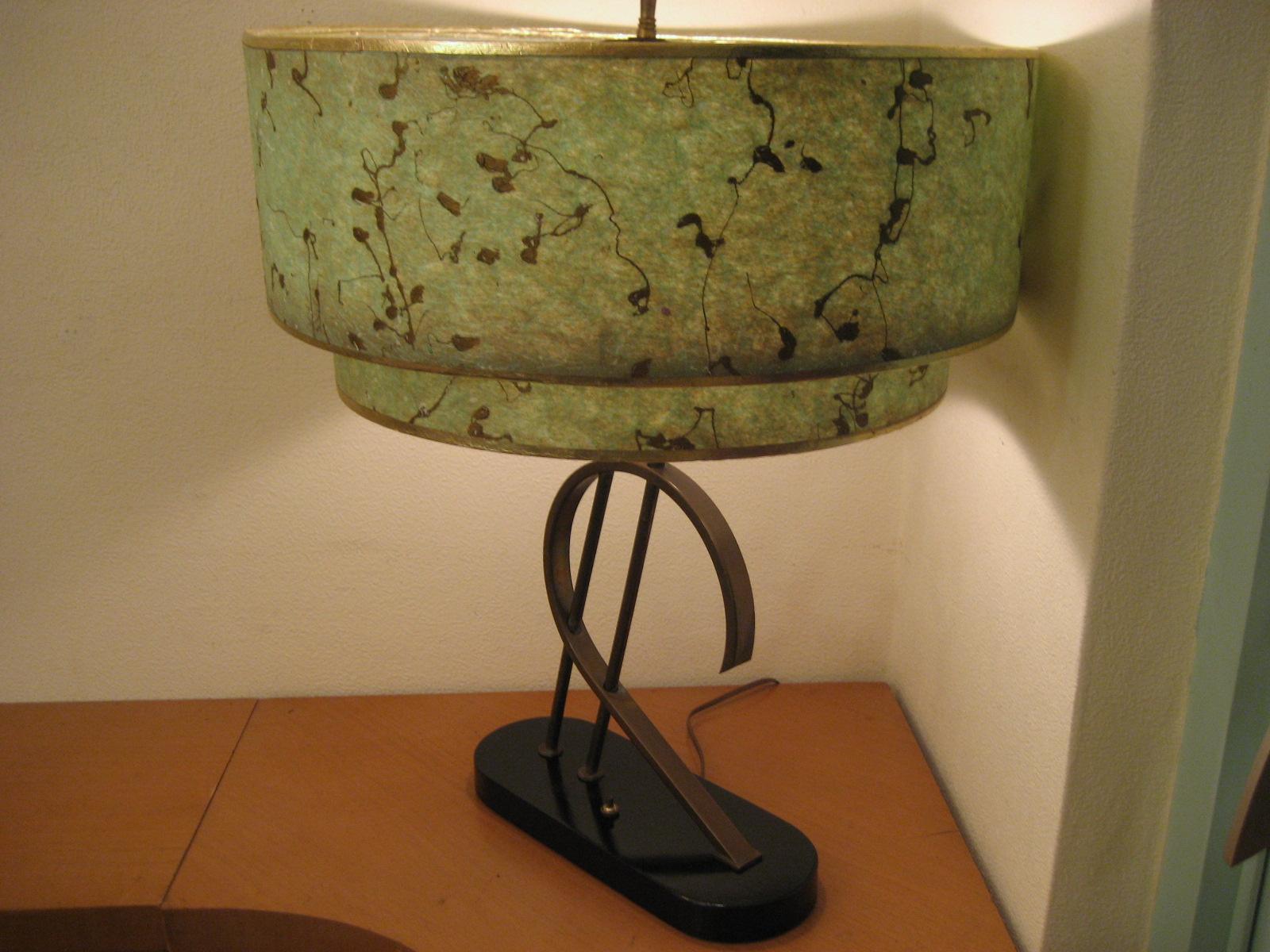 | アトミックビンテージシェードランプ / 50年代 USA. ビンテージマジェスティックシェードランプ。シェードは上がデカイ2段タイプのファイバーグラスメイド。ブラックウッドベースにアトミックシェイプのゴールドブラスデコ。クールでGOODなライティングピース! 電源は家庭用コンセント対応コード、スイッチはベースに付いていてプッシュタイプ。 |