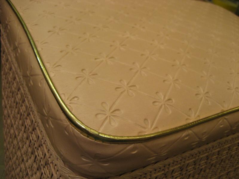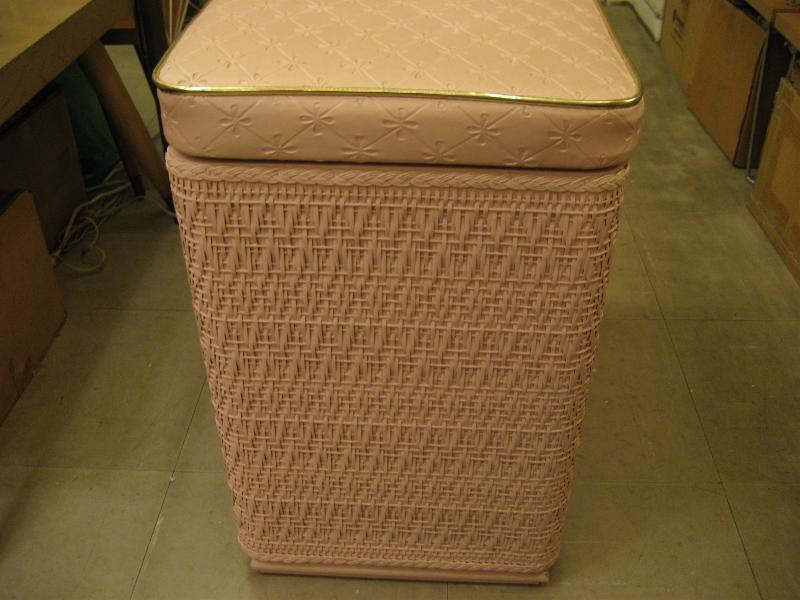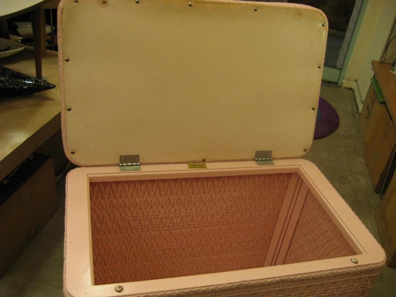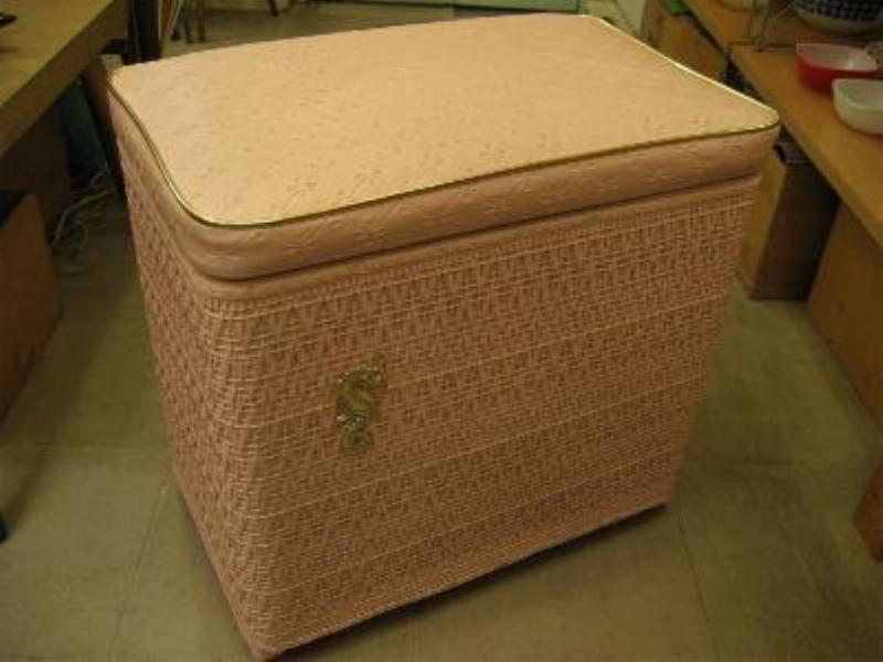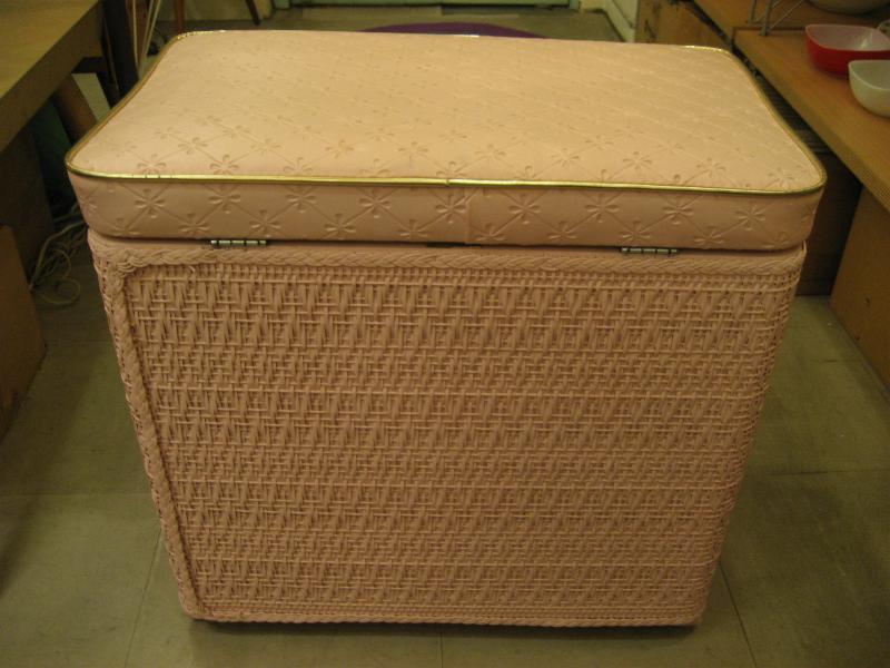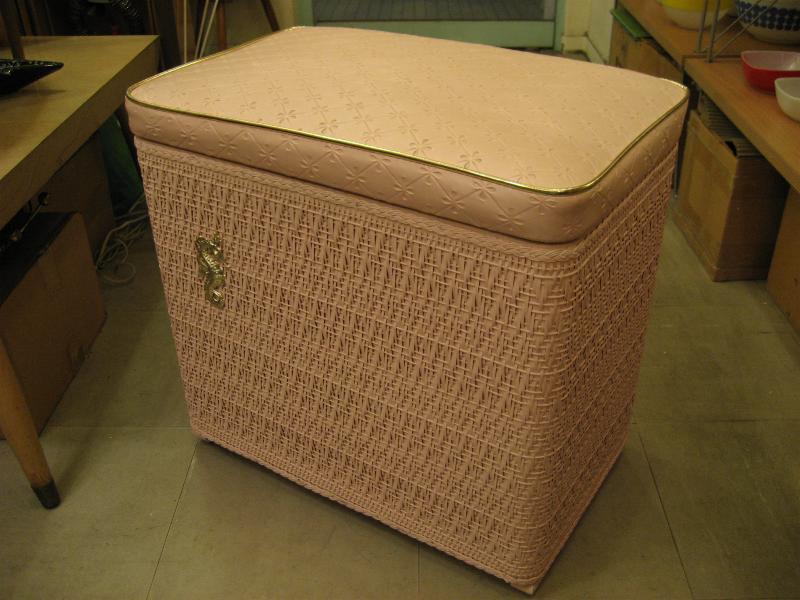 | アトミックビンテージハンパー / 50年代 Harvey社製 USA ピンク/ゴールドのクールでキュートなハンパー(洗濯物入れ)です。フロントに"タツノオトシゴ"のゴールドアクセント。実際に洗濯物入れとして使っても良し、トップのフタにクッションが入っているのでテレフォンチェアなどにも良いですよ。洗濯するのが楽しくなるGOODピースです! |