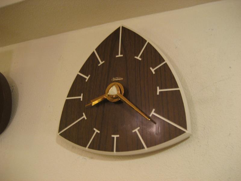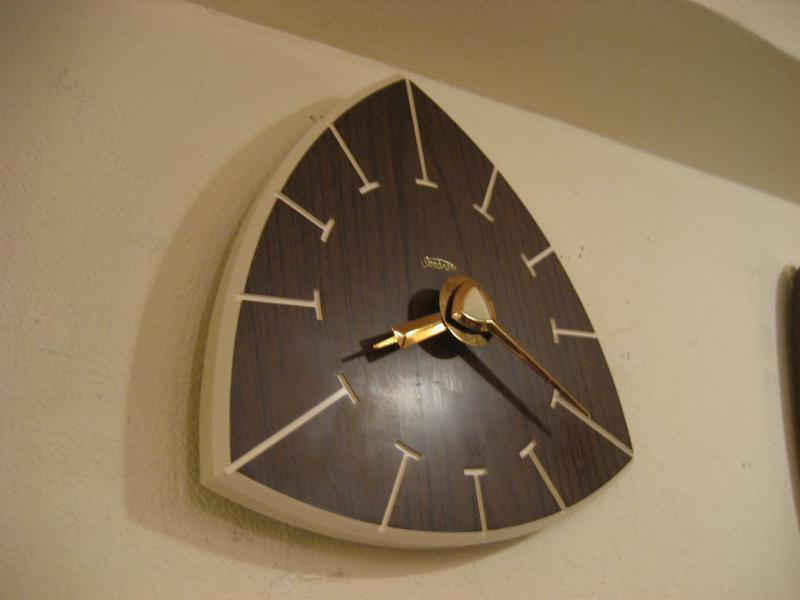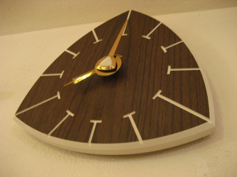 IN USA. WOOD調フェイスのモダンでシンプルな壁掛け時計。トライアングルシェイプのプラスティックボディにゴールドメタルハンド。モダンでアトミックなタイムピースです! ムーブメントはバッテリータイプ(単3x1個使用)に交換済みでですので時間は正確です。 |