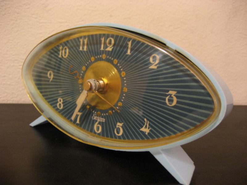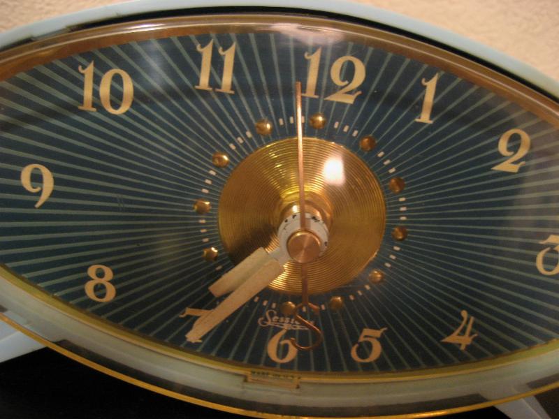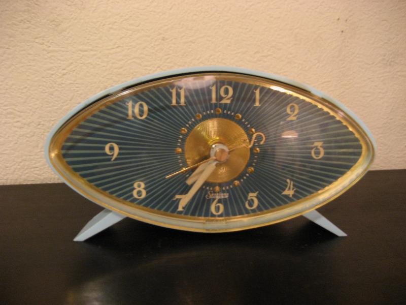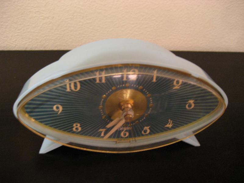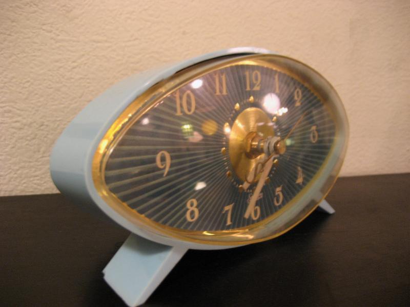 IN USA. 50年代独特のEYEシェイプのクールな置時計です。ボディカラーはミントブルーで文字盤はダークブルーにミントブルーのスターバーストタイプ。センターゴールドアクセントカラー。クールでアトミックなタイムピースです! ムーブメントはバッテリータイプ(単3x1個使用)に交換済みでですので時間は正確です。 |