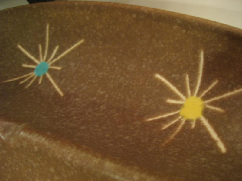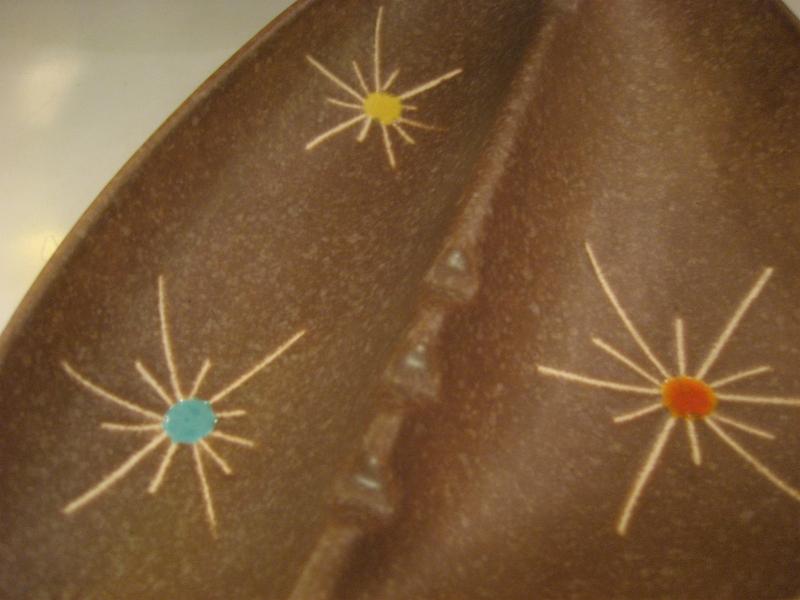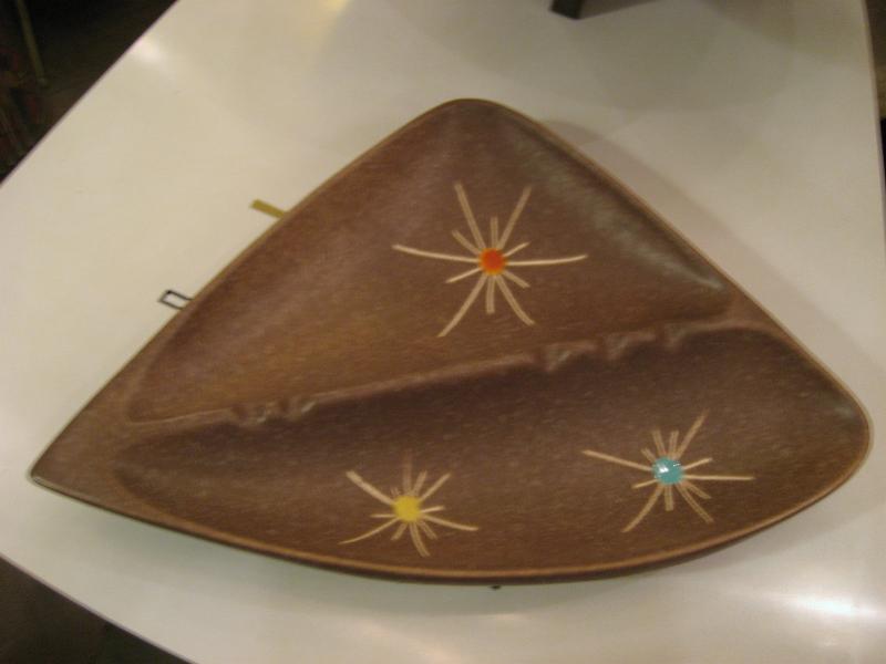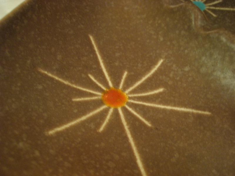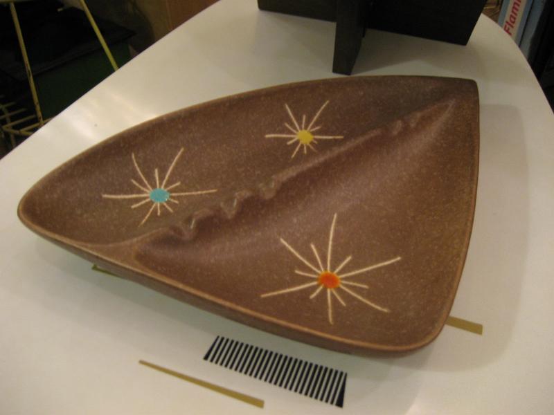 | ビンテージスターバーストアッシュトレイ / 50年代 USA. カリフォルニア陶器の代表的なアトミックビンテージ灰皿です。BIGなブーメランシェイプでテーブル上の存在感は最高です!スターバーストの絵柄はターコイズブルー・オレンジ・イエローの3色センターカラータイプ、ベースカラーはモダンブラウン。クールアトミックなスモーキングピース! |