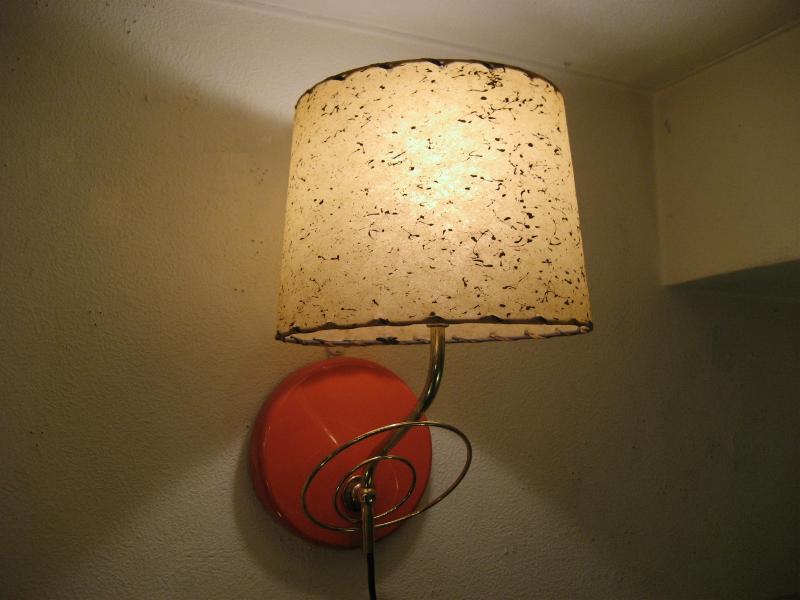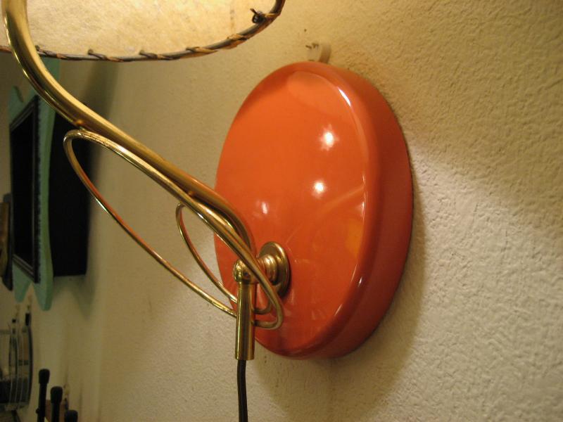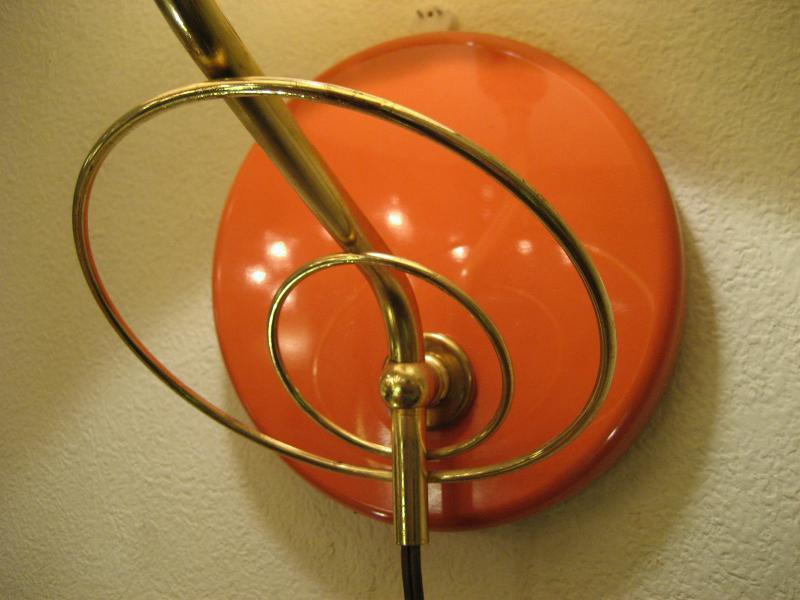 | ビンテージアトミックウォールシェードランプ / 50-60年代 USA. ファイバーグラスシェードタイプの壁掛けランプ。オレンジカラーのメタルラウンドベースにゴールドブラスアトミックデコがクールでキュート。お部屋の壁や廊下、階段などアクセントランプにGOODなライティングピース! 電源は家庭用コンセント対応コードでスイッチはランプソケットに付いていてスライドタイプ。 |