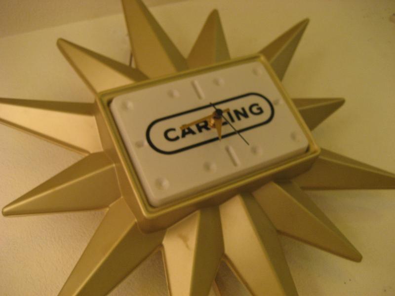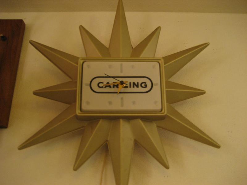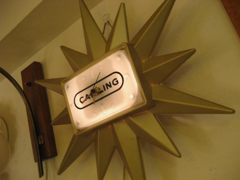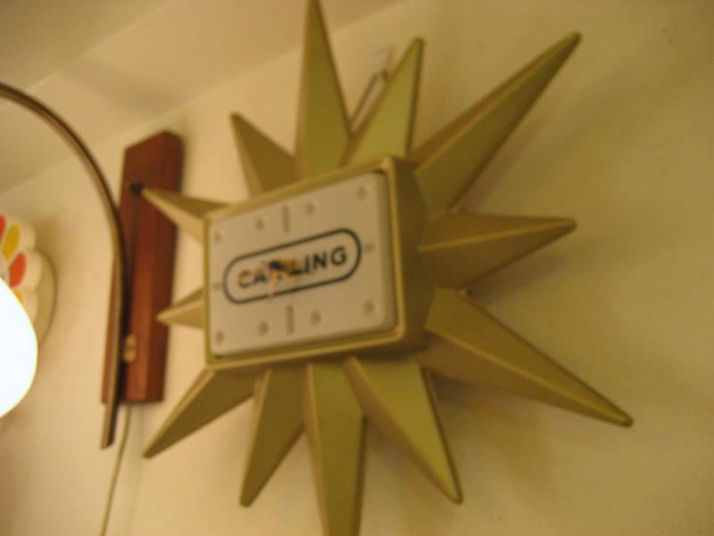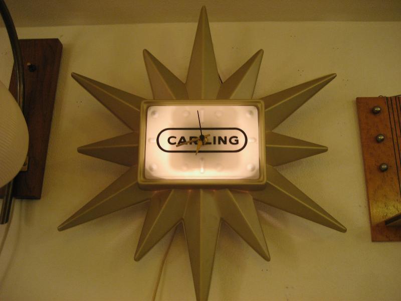 | スターバーストライトアップサインクロック / 60年代 USA "CARLING BEER" のサインクロック。プラスチックメイドのゴールドスターバーストフレームにスクエアクロックパネル。裏側下部分のスイッチでセンタークロックパネルがライトアップします。クールでGOODなウォールディスプレイピース! 電源は家庭用コンセント対応でスイッチはロータリータイプ。 |