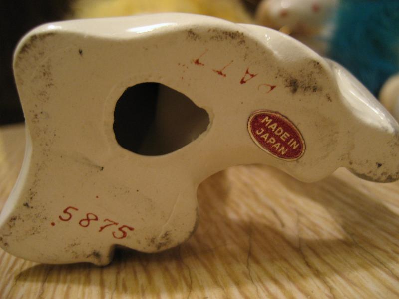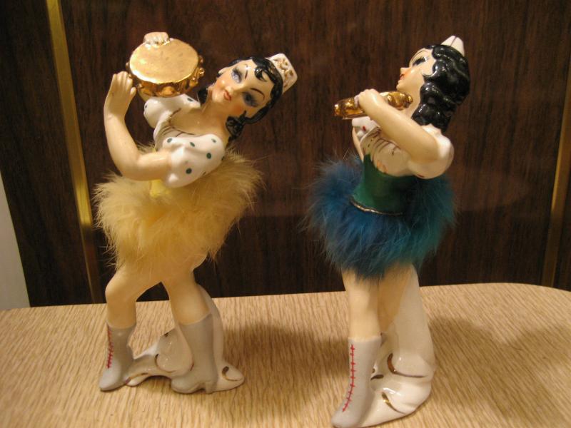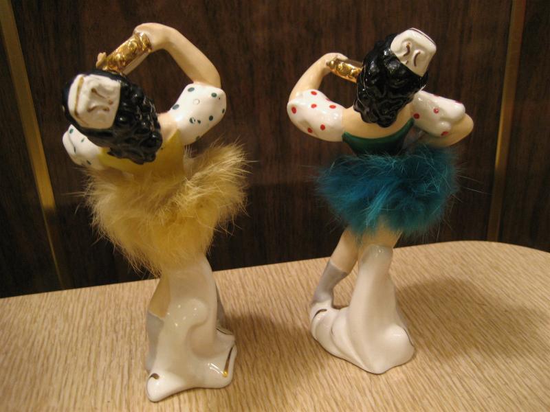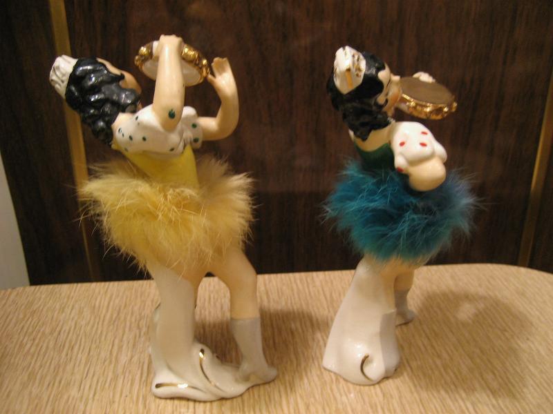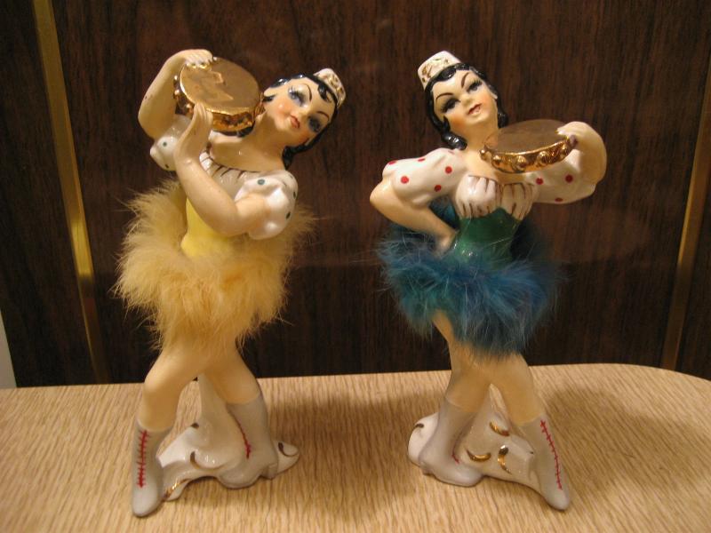 | ペアビンテージ置物 / 50年代 USA. 陶器製ダンサーペア。タンバリンを持って踊っているポーズで色違いの衣装を着ています。デビルレディなどと同年代頃の物と思われ、顔やウェストのファーデザインなど共通点も多くレアなペアです。 |