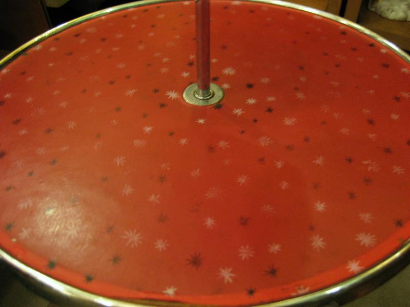 | アトミックアッシュトレイテーブル / 50年代 USA. 赤い天板カラーベースにホワイトとブラックのスターバースト絵柄がデザインされたアトミック灰皿付テーブル。ブラックアイアンのブーメランシェイプ3本レッグで先端に赤いレッグカバー付き。テーブルセンターにクロームメッキメイドのメタルアッシュトレイが立っていて、写真のように抜き差しが簡単にできますので掃除もラクチンです! ソファやチェアサイドはもちろん、ベランダなどにもGOODなフロアピース! |