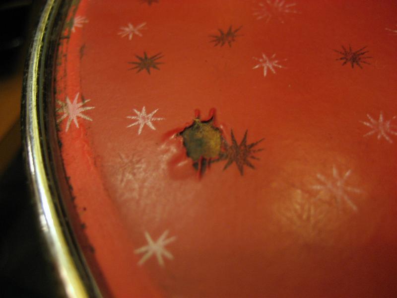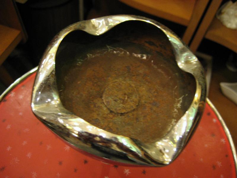 | アッシュトレイ内側にサビが出ています。天板の絵柄に少し薄い部分があるのと1ヶ所おそらく焦げらしきところ(写真参照)が見られます。全体的に良いビンテージコンディションです。 | |