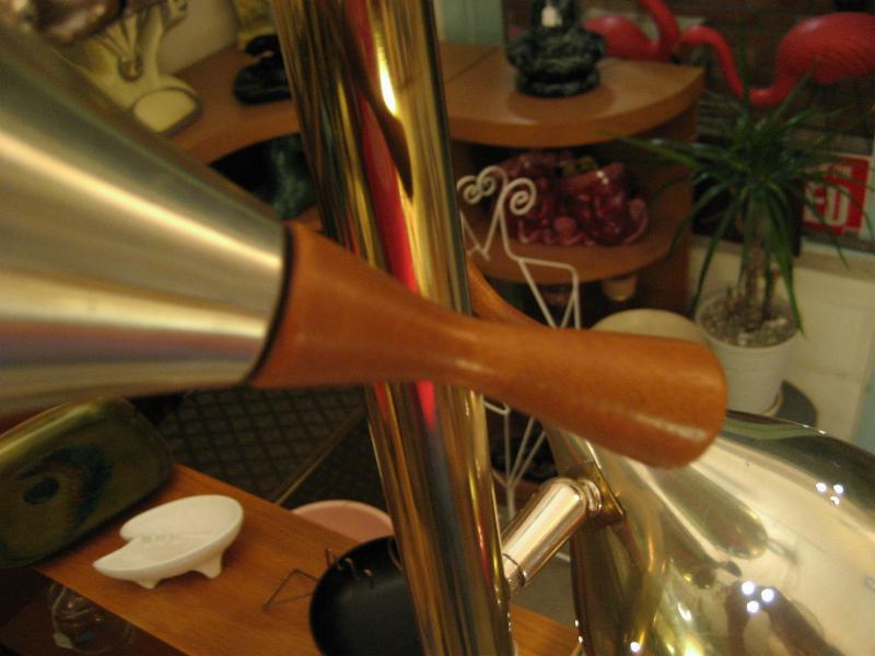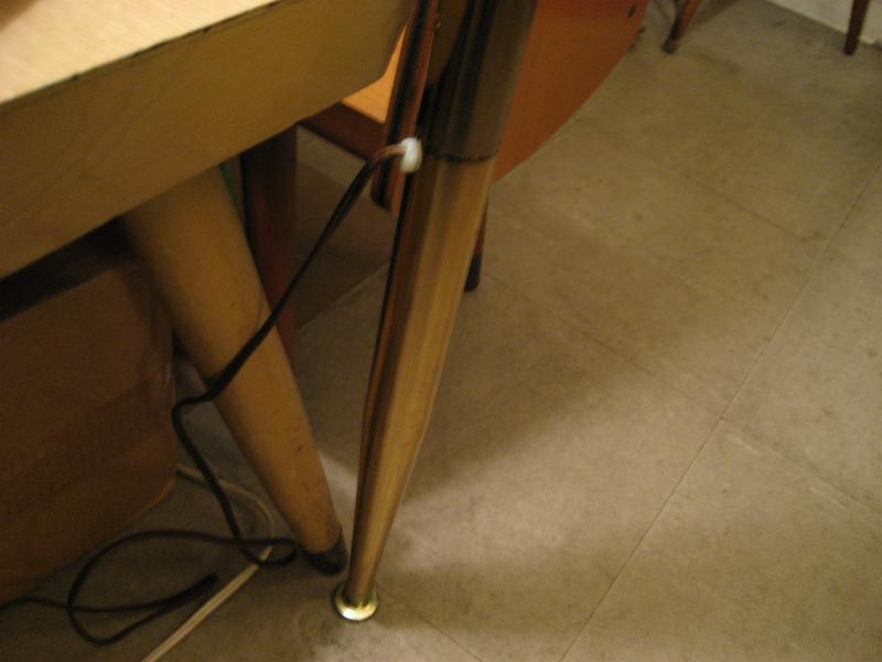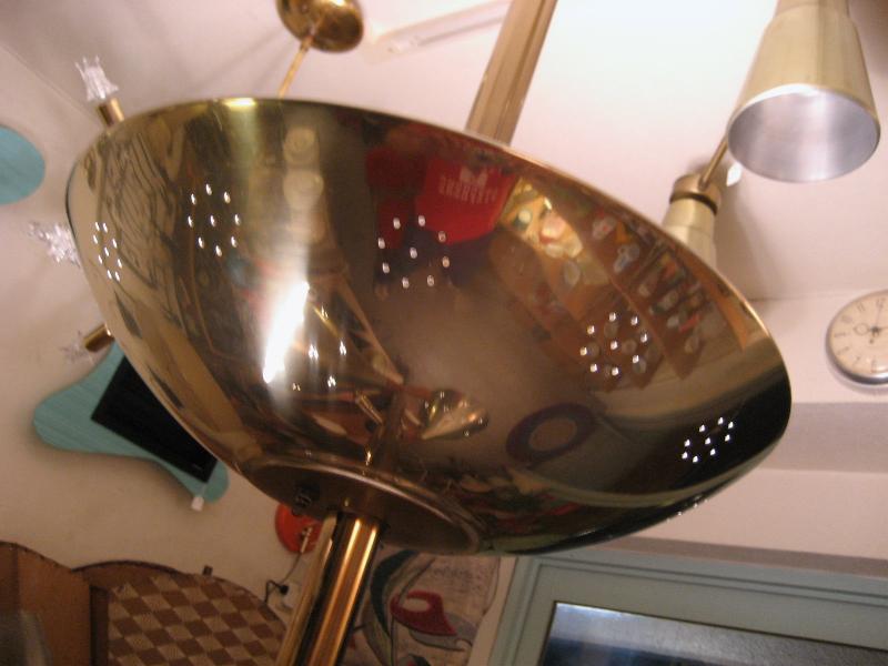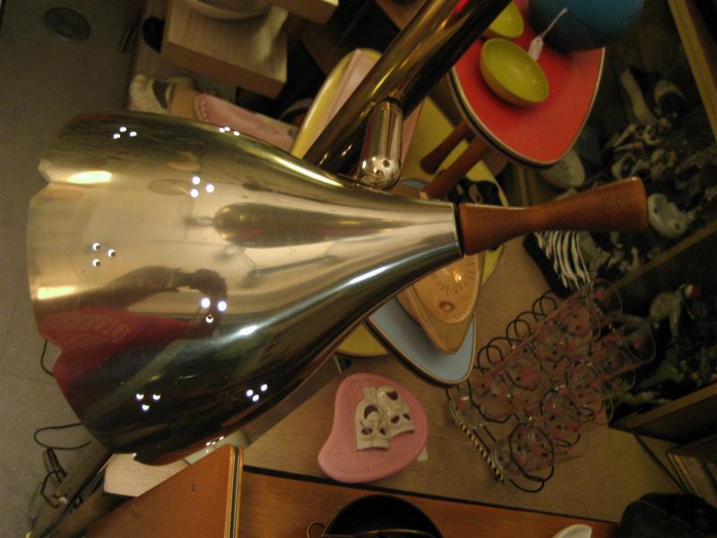 | アトミックフロアポールランプ / 50-60年代 USA.. アッパーシェード&2スポットのクールなフロアポールランプ。天井と床に突っ張らせるスプリングロッドタイプでアッパーシェードは3バルブ、スポットシェード後部にウッドデコ付き。クールでGOODなアトミックライティングピースです! 電源は家庭用コンセント対応コードで、スイッチはスポット用(3Way)がポール部分に、アッパー用(4Way)はアッパーシェード下にそれぞれ付いています。 |