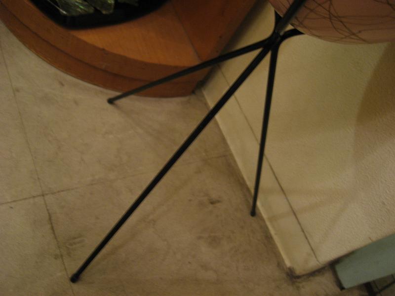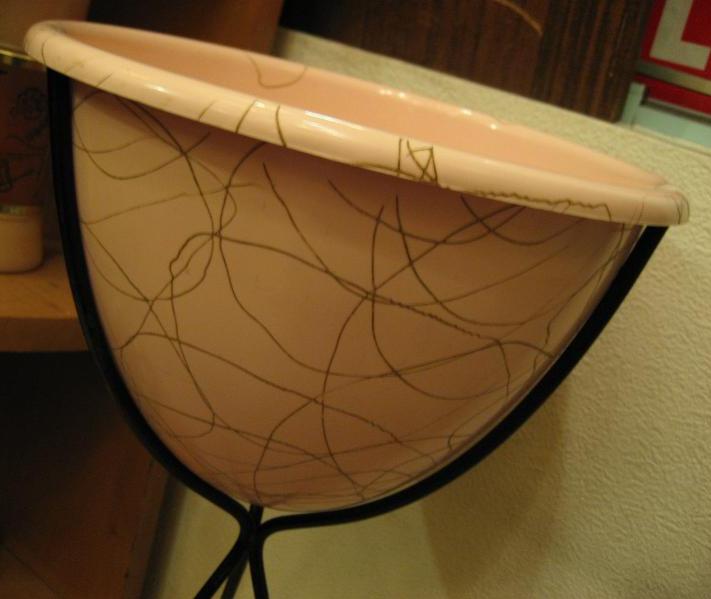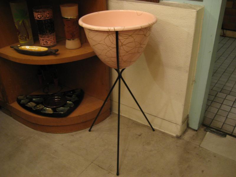 | ビンテージアトミックフロアプランター / 50年代 ピンクベースにゴールドアトミックスワールアクセントのプラスチックメイドポット、ブラックアイアンスタンド。クールでGOODなフロアプランターです。 |