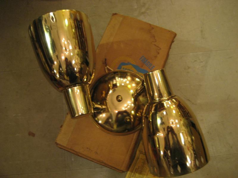 デッドストック(未使用) デッドストックの2スポットゴールドブラスシェード壁掛けランプです。簡単な組み立て式でオリジナル配送BOX入り、取説付き。壁直付け用ステー金具類が付いていますのでコード類を壁に出したくない方、特にオススメです。クールでGOODなウォールライティングピース! スイッチはウォールマウントベースに付いていてロータリー式(3Way)です。 ※壁直付けではなく壁にフックなどを使って掛けて電源コードをお部屋のコンセントに差し込んで使用されたい場合は加工(無料)いたしますのでご相談ください。 |