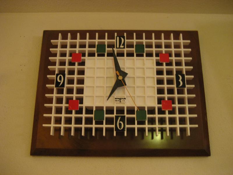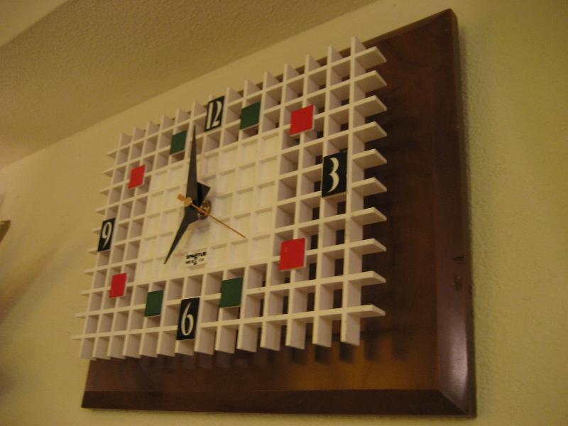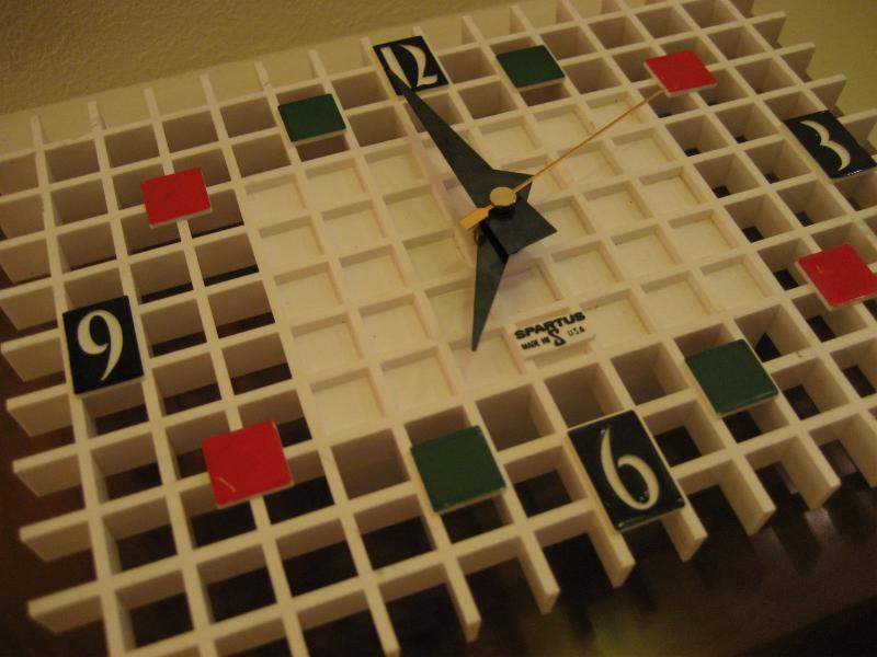 | ビンテージモダンウォールクロック 60年代 SPARTUS社製 MADE IN USA. プラスチックメイド。WOOD調のウォールマウントベースにホワイトカラーのスクエアメッシュパネル文字盤。カラータイル調のダイヤルアクセントがキュートな壁掛け時計。リビングはもちろん、キッチンやキッズルームにもGOODなビンテージタイムピースです! ムーブメントはバッテリータイプ(単3x1個使用)に交換済みでですので時間は正確です。 |