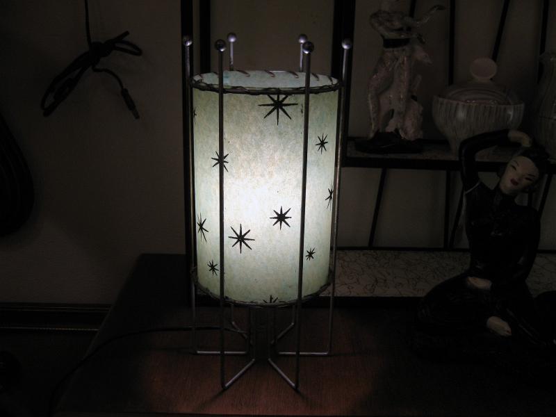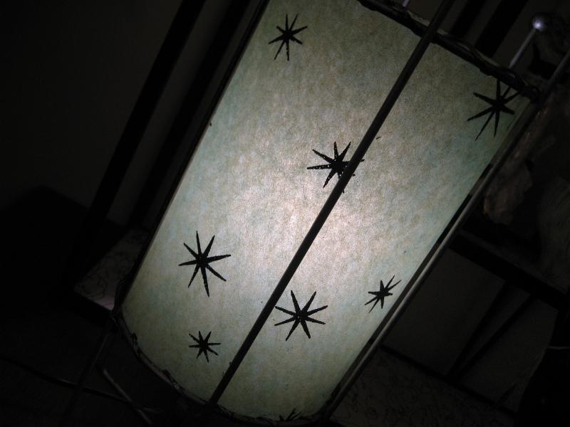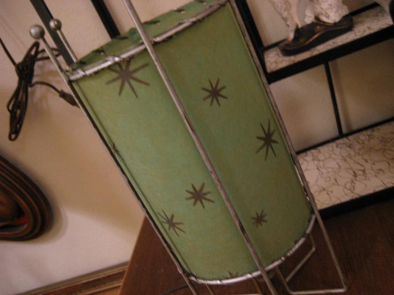 | ペアビンテージスターバーストシェードランプ 50-60年代 USA ファイバーグラスシェードにアトミックスターバーストプリントのテーブルアクセントランプです。メタル製アトミックフレームにグリーンカラーインナーファイバーグラスシェード。電源は家庭用コンセント対応です。スイッチはシェード側面から出ていてロータリータイプ。 |