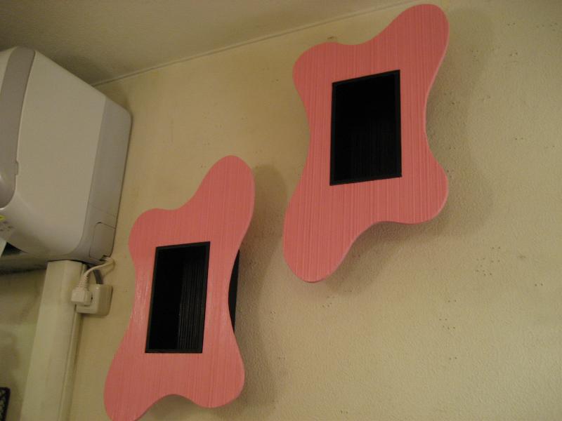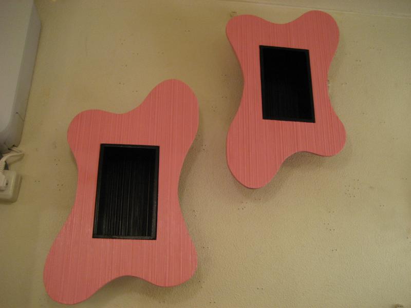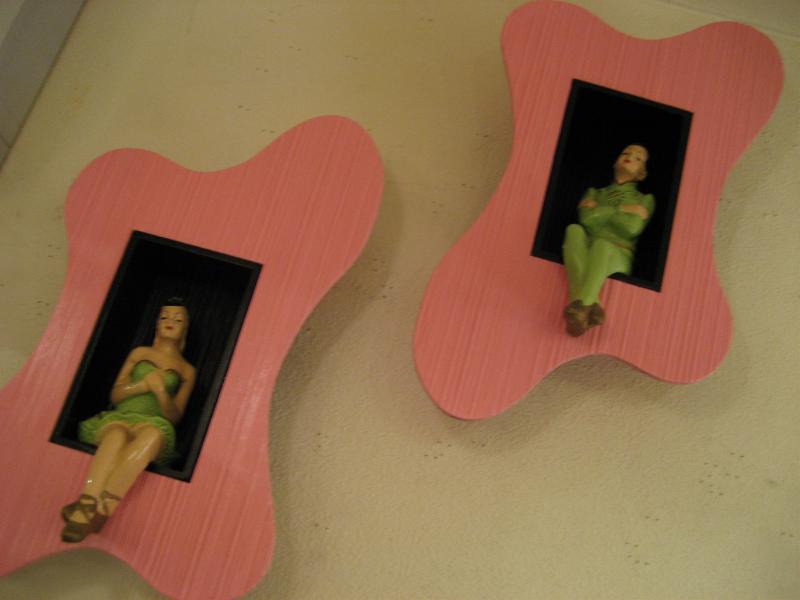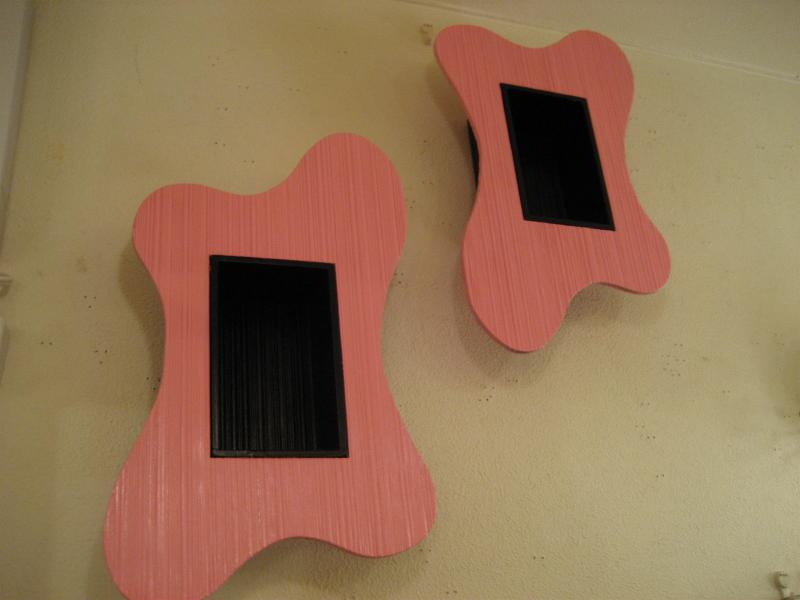 | ペアアトミックシャドウボックスウォールシェルフ / 50年代 USA アトミックシェイプのウォールシェルフセット。ブーメランシェイプにクールでキュートなピンクとブラックのツートーンカラー。置物などのディスプレイにGOODなクールウォールピース! |