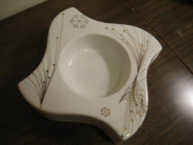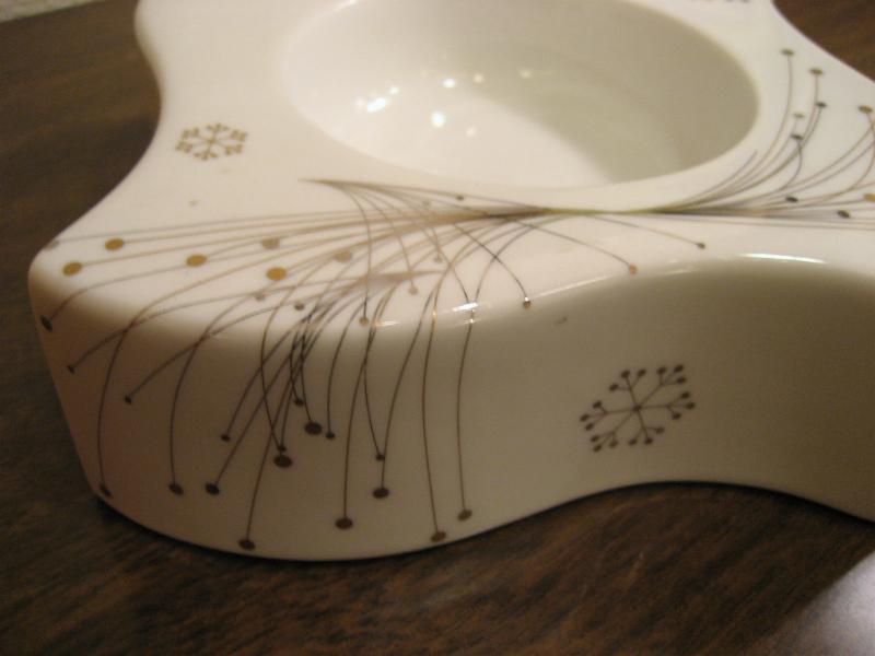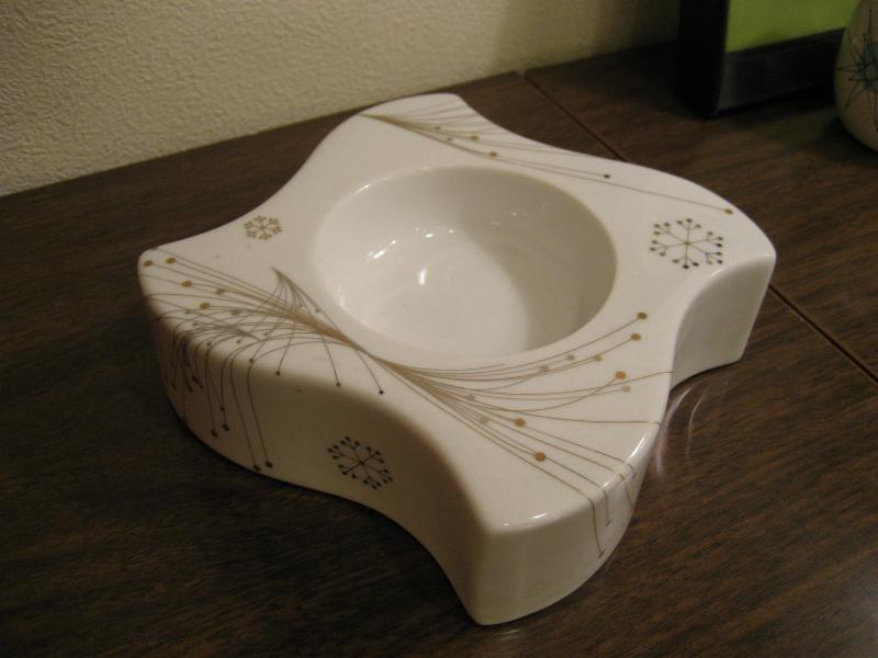 | ビンテージアトミック灰皿 / 50-60年代 USA 陶器製のアトミック絵柄がクールなビンテージアッシュトレイ。ホワイトベースにゴールドアクセントカラーのスター&スノーフレーク調のデザイン絵柄。厚みのあるフォルムも風車のようなブーメランシェイプでクールなGOODスモーキング&ディスプレイピース! |
