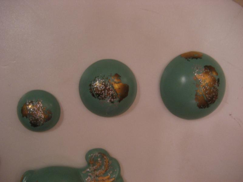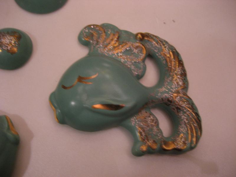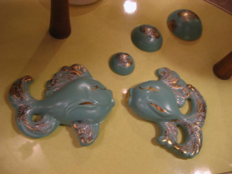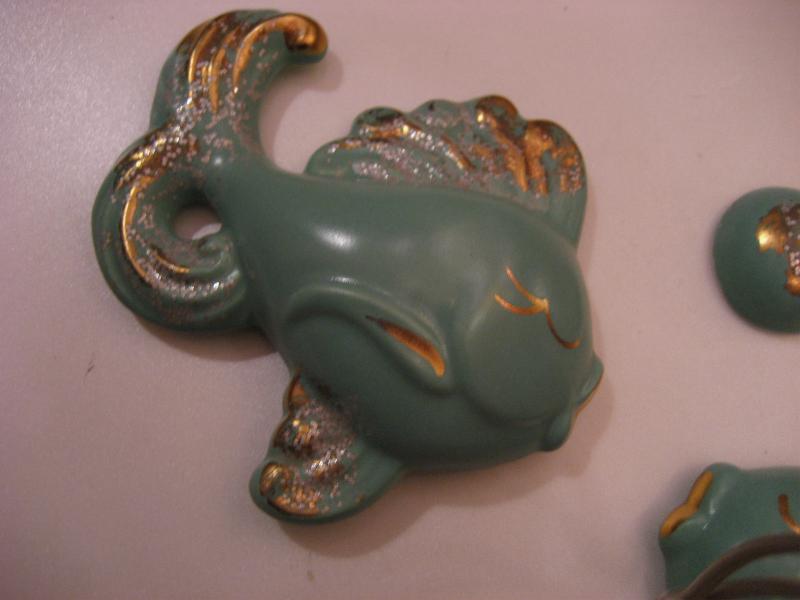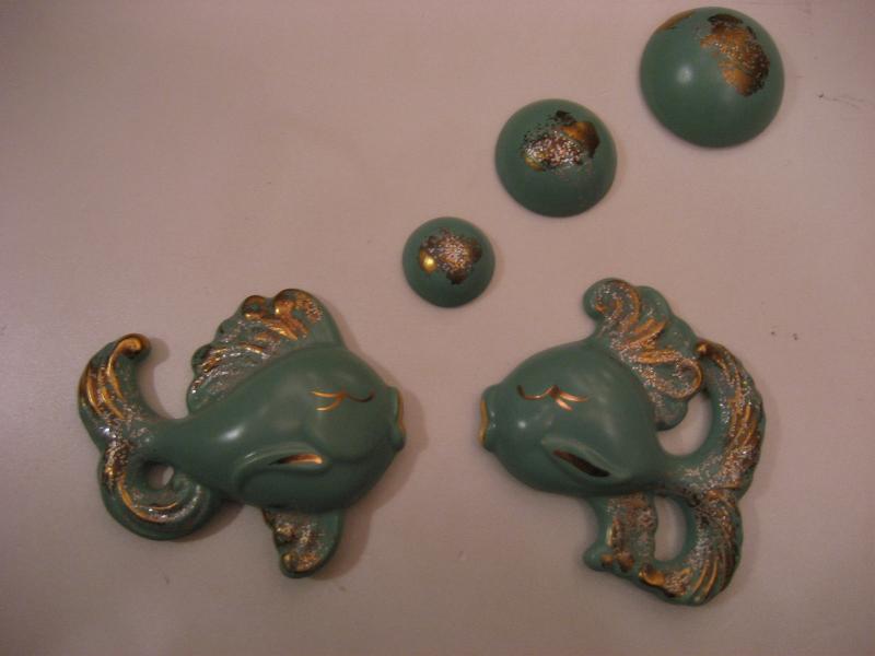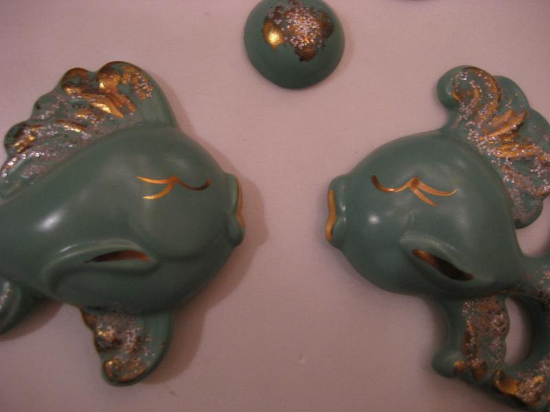 | ビンテージフィッシュ&バブルウォールデコ / 50年代 USA 陶器製のサカナとバブル(泡)3pcの壁掛けセットです。くすんだミントグリーンにゴールドアクセントカラー。バスルームやKIDSルーム、もちろんリビングやダイニングなどなど、とってもキュートでGOODなウォールデコレーションピース! |
