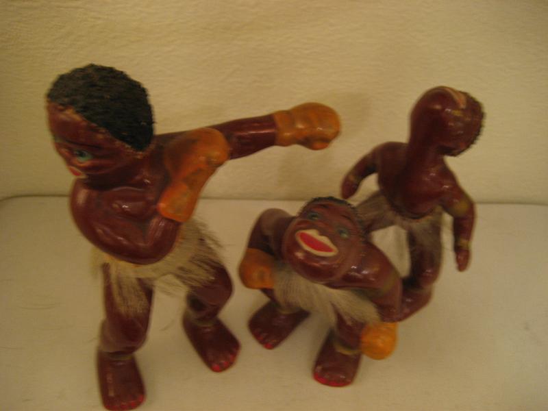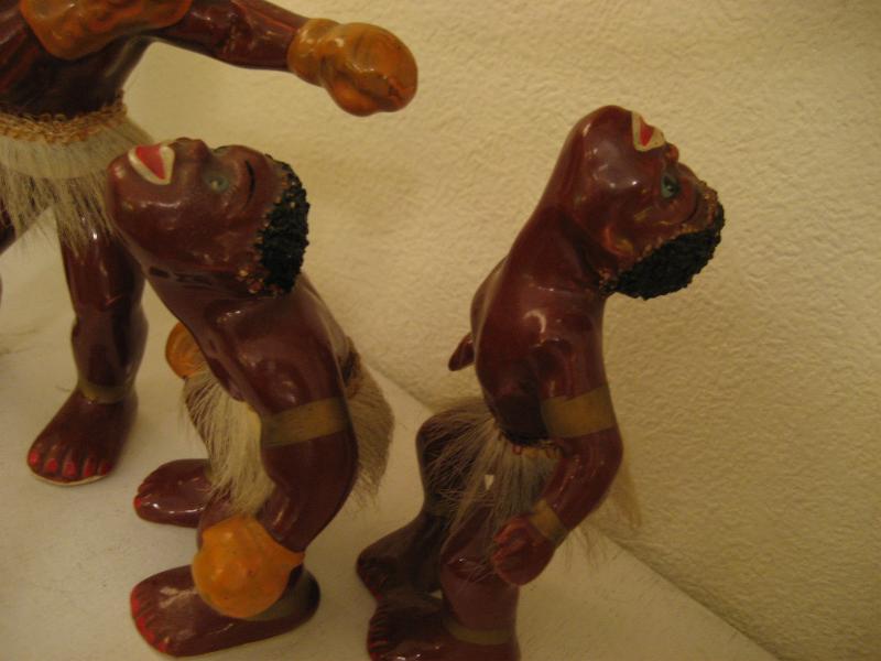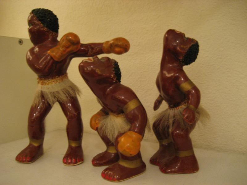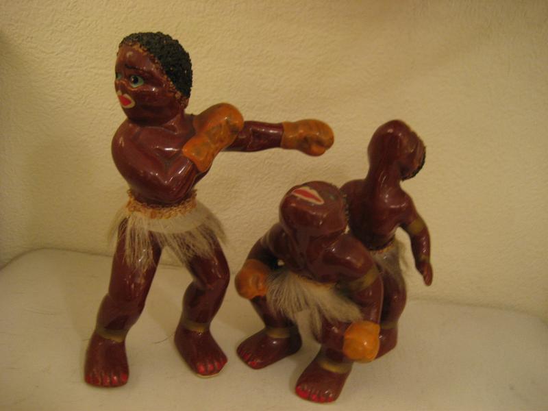 | ビンテージブラック置物3pcセット / 40-50年代 USA. 陶器製のブラック置物セットでボクシングシリーズ。左側の男と真ん中の男が戦っていて右側の男がレフリー。"真ん中の男がしゃがんでよけた左側の男のストレートをレフリーが顔面に食らった" というポーズ。いかにもアメリカらしい3体セットです。ディスプレイにGOODなクール&キュートデコレーションピース! |