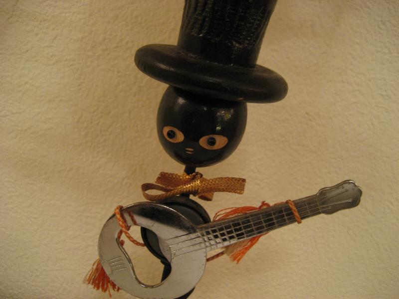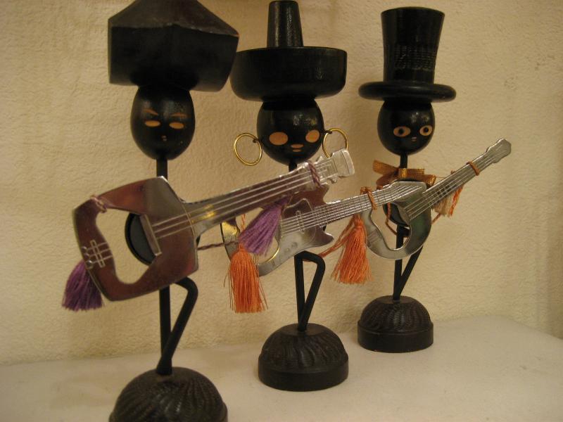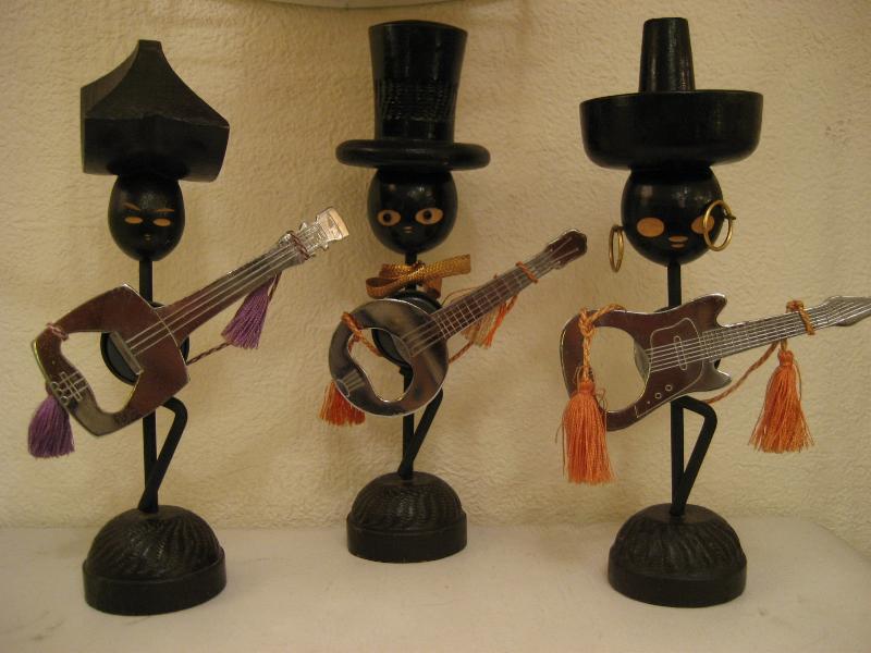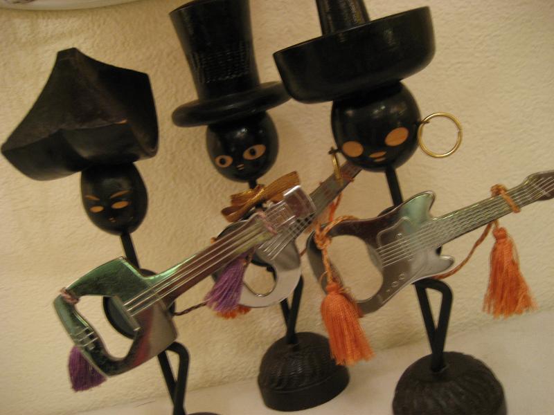 | ビンテージブラック置物 / BARウェア / 栓抜き 50年代 IDEAL USA. WOODとアイアンメイドのブラックモチーフBARウェア。それぞれ違ったデザインで弦楽器シェイプの栓抜きが磁石でくっついています。ディスプレイにGOODなクールデコレーションピース! |