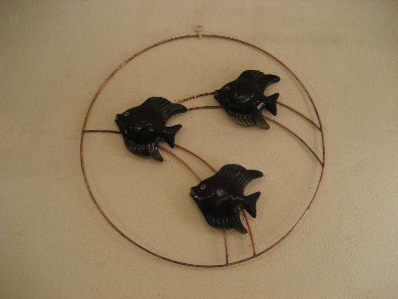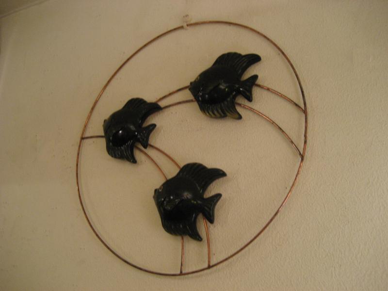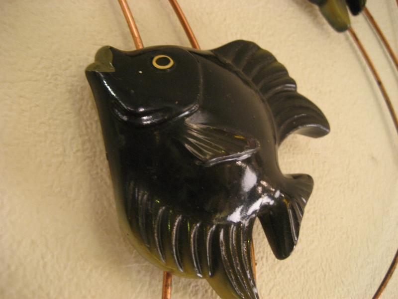 | ビンテージフィッシュウォールデコ / 50年代 USA ミラースタジオ社 ©1957 アトミックラウンドワイヤーバックに3pcフィッシュの壁掛けです。ブラックベースに薄いグリーンアクセントのチョークメイドのサカナ。リビングはもちろん、キッチンやバスルームなどにもGOODなウォールデコレーションピース! |