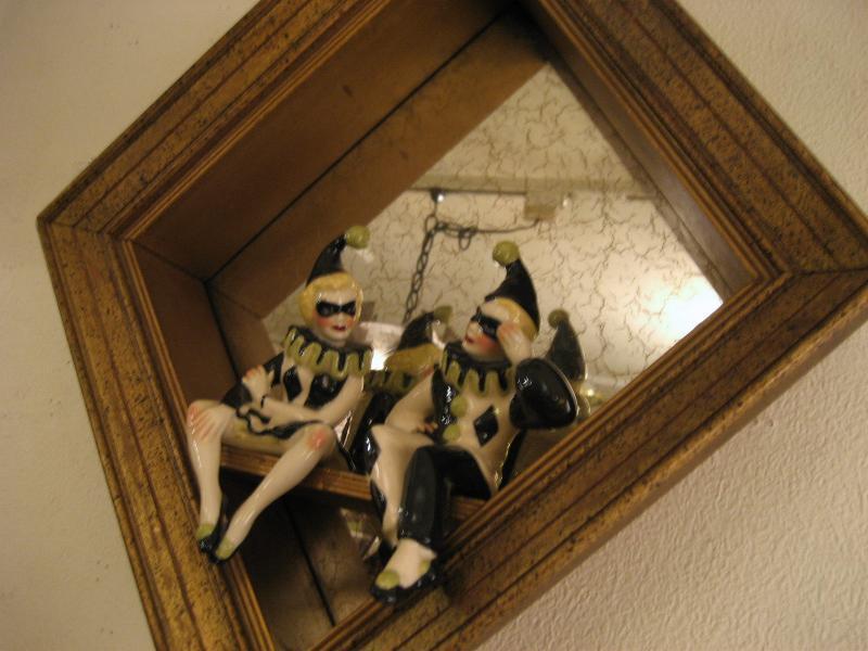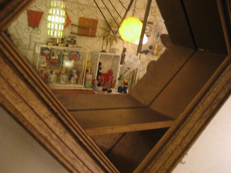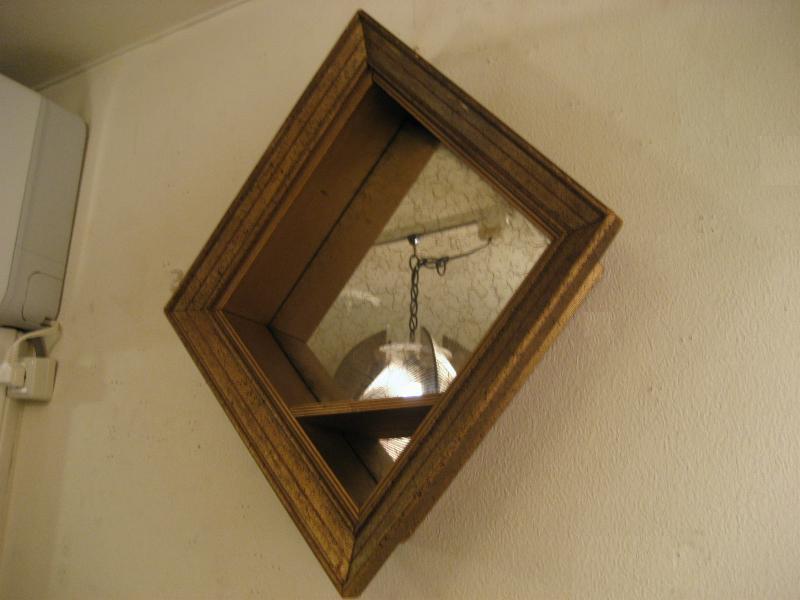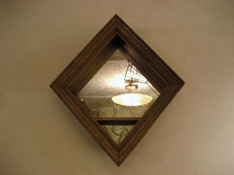 | アトミックシャドウボックスウォールシェルフ / 50年代 USA ミラーバックタイプウォールシェルフ。ハーレクインシェイプのダイヤ型フレームにクールな柄入りミラー。置物などのディスプレイにGOODなビンテージウォールピース! ※写真内の置物は含まれません |