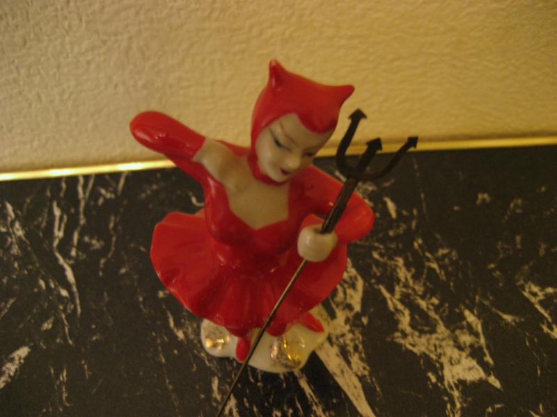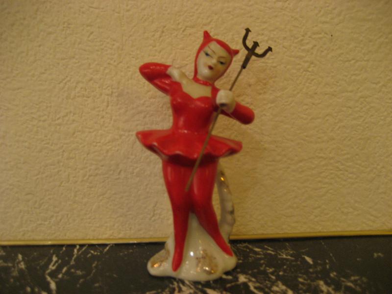 | ビンテージデビル置物 / 50年代 USA 1958年 陶器製デビルレディの置物。小さめのタイプで手に真鍮製のフォークを持っています。底面に手書きで "・・・JUNE 1958 ・・・" と書かれていて、おそらく当時購入した人が1958年の6月に誰かへのプレゼントや記念ギフトなどにした物と思われます。クールな顔立ちがGOODなビンテージコレクティブルピース! |