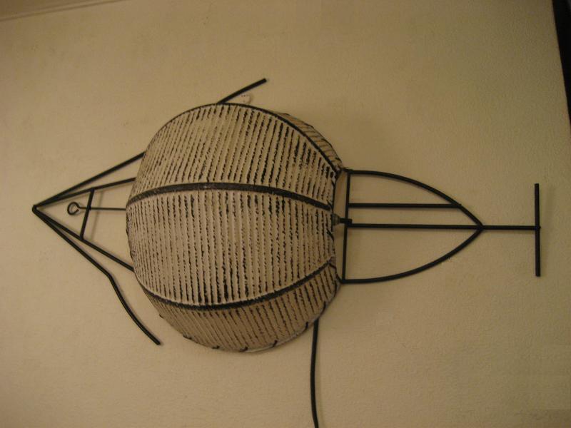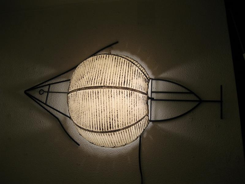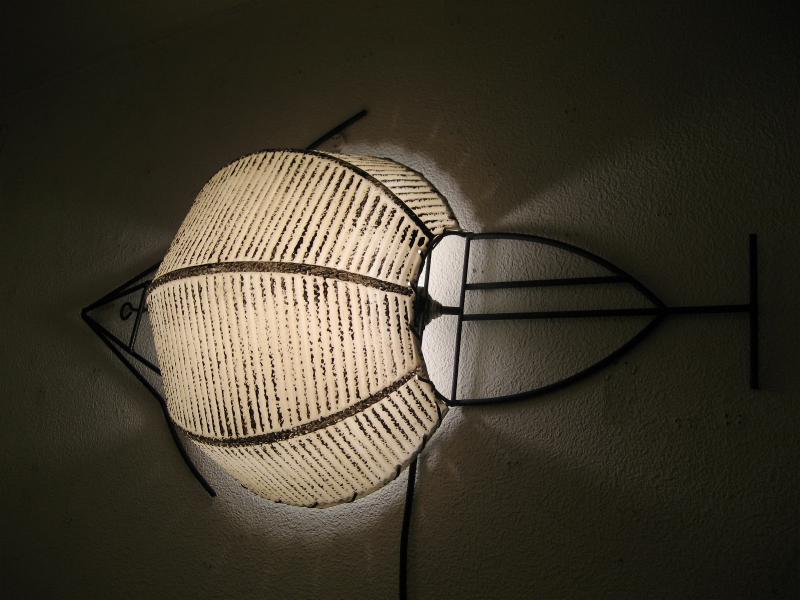 | ビンテージウォールシェードランプ / 50年代 USA. ウェインバーグを彷彿させるアイアンメイドのフィッシュシェイプ壁掛けシェードランプ。サカナのおなか部分がプラスチックメイドのシェードになっています。お部屋の壁や廊下、階段などアクセントランプにGOODなミッドセンチュリーライティングピース! 電源は家庭用コンセント対応コードでスイッチはランプソケットに付いていてロータリー式。 |
